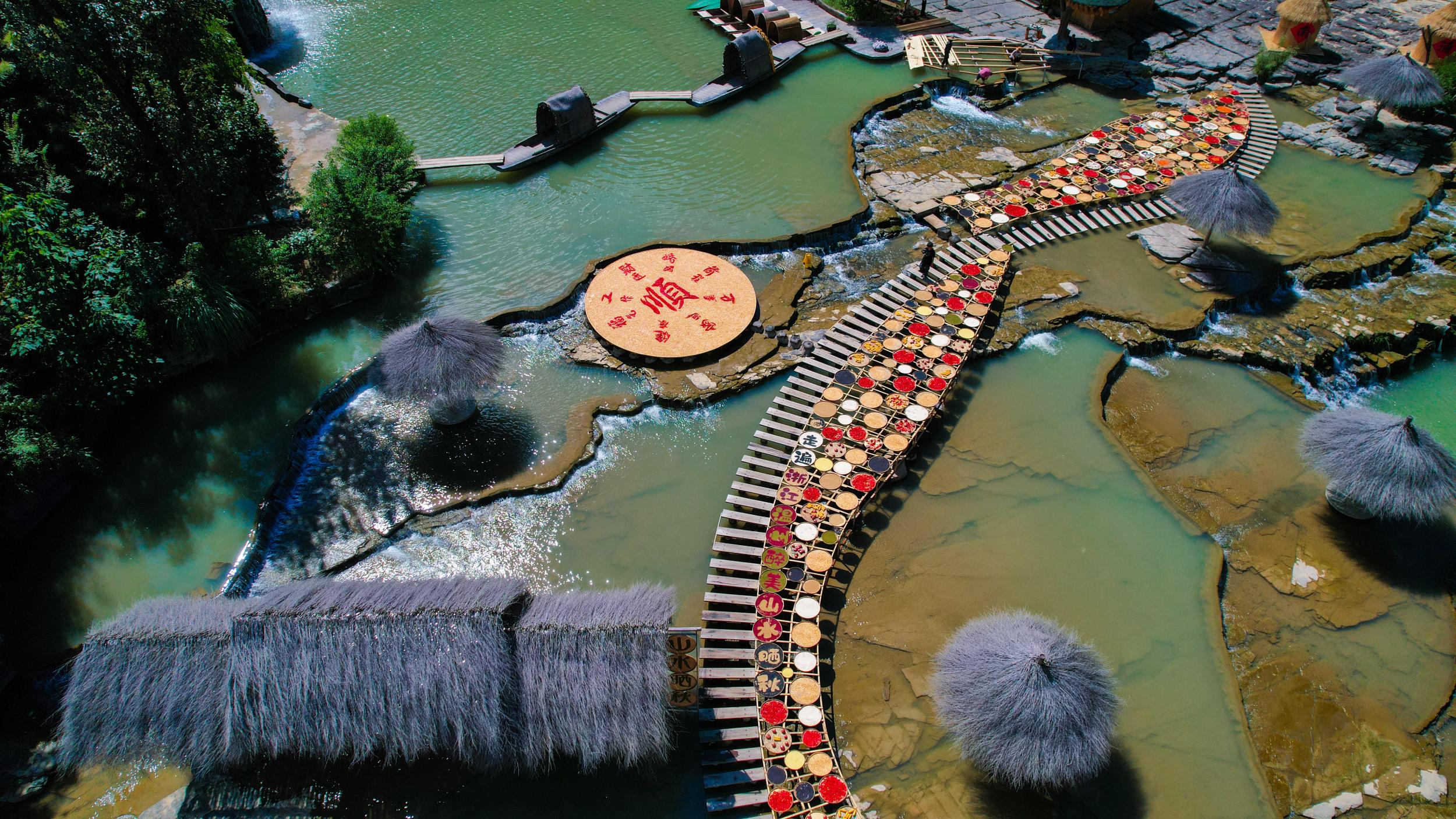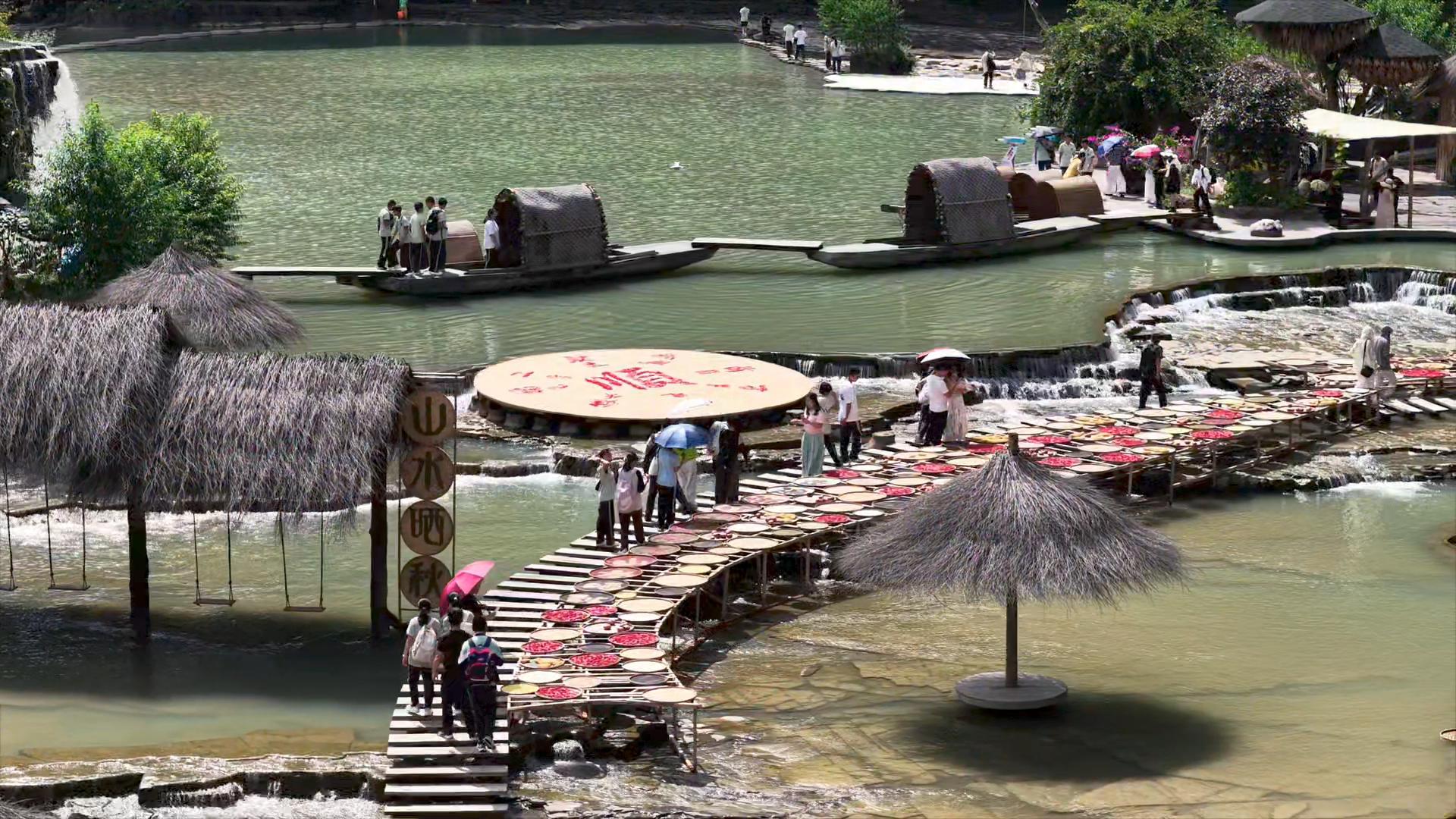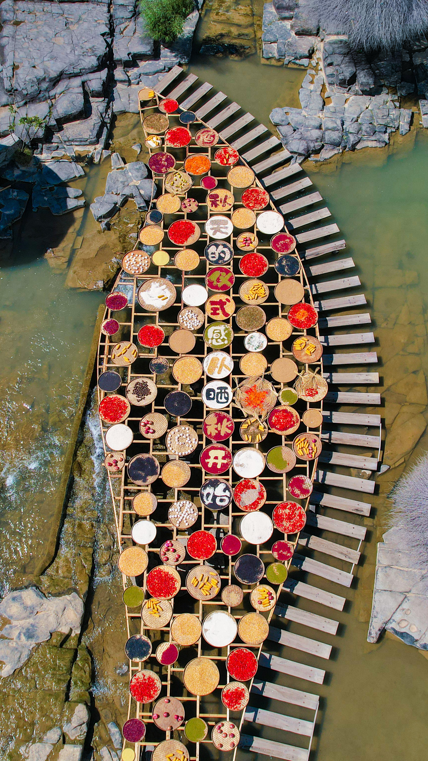 南浦溪的灵秀山水,还为这场晒秋盛宴提供了独一无二的舞台。潺潺溪流、群瀑飞泻之间,景区匠心独运地搭建起“水上晒场”。乌篷船悠悠荡漾于碧波之上,晒秋架临水而设,小桥、流水和多彩晒秋场景结合,共同勾勒出一幅流动的、充满诗意的“晒秋水寨图”。移步换景,龙尾滩上精心布置的农耕文化墙、粮仓、南瓜屋、谷物亭、中国地图、五星红旗,以及寄托美好生活祝愿的“八大顺”谷物圆盘——“工作顺、财运顺、婚姻顺、前程顺、万事顺、家运顺、健康顺、福气顺”,呼应着“走走泰顺,一切都顺”的吉祥寓意。这些打卡点无不吸引着四方游人驻足流连、拍照留念,一起沉浸式体验这场山水间丰收狂欢。