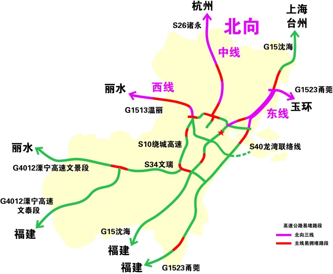 1.跨市长途出行往杭州、上海方向的车辆,建议绕行沈海高速、温丽高速。