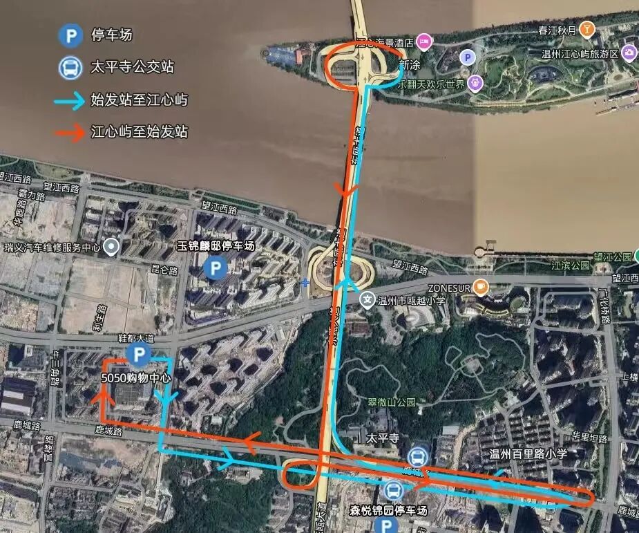 江心屿:位于温州市区北面瓯江中游,5050购物中心可乘坐景区免费接驳车前往(行驶范围:从江心西园始发,途经东瓯大桥、鹿城路双星路调头、鹿城路、营楼路(往行)、瓯南路(返行)至5050停车广场)。