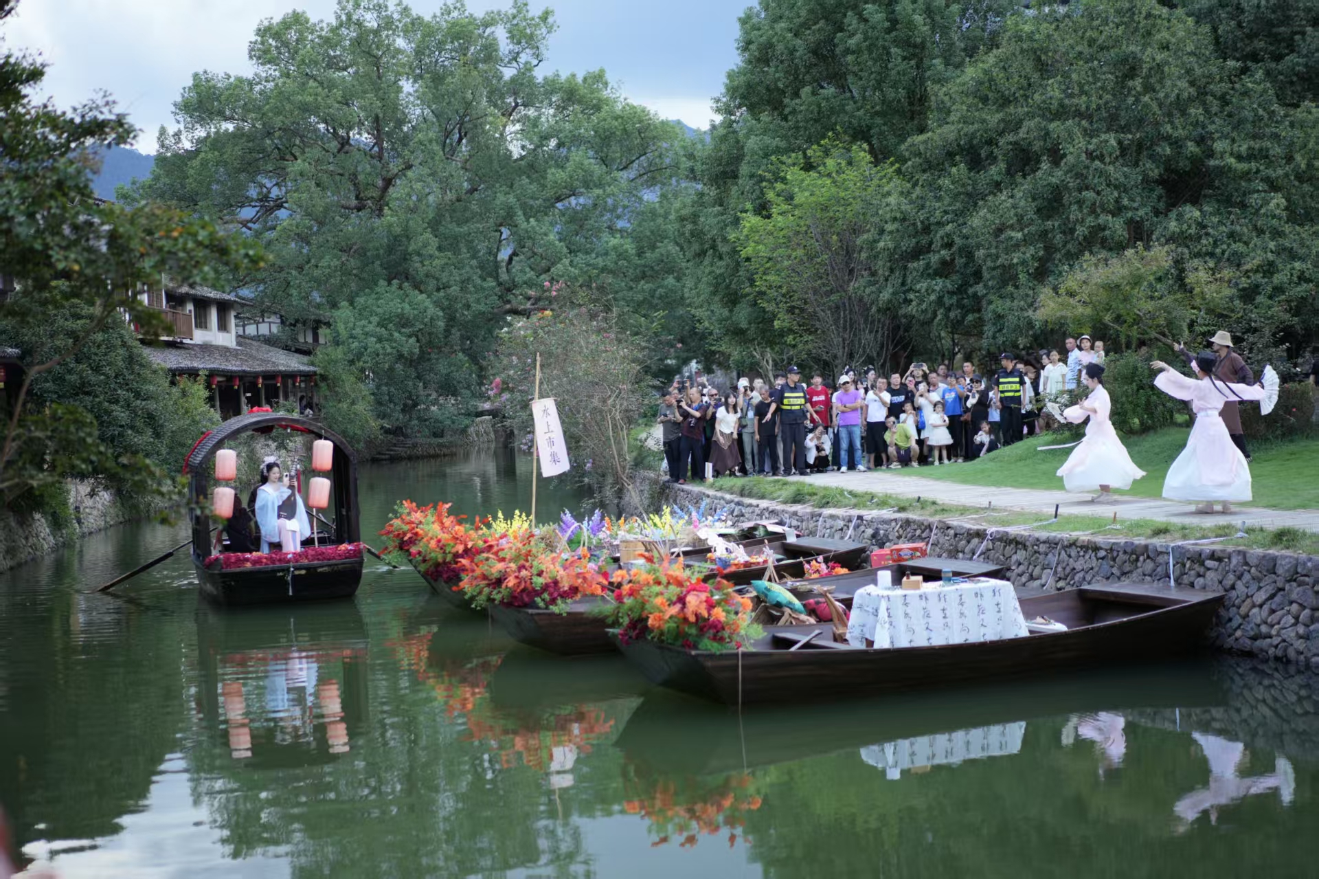 国庆中秋长假首日,永嘉楠溪江景区内,丽水街雅集、潮玩芙蓉等活动现场热闹非凡。游客们身着汉服,穿梭于古色古香的街巷,体验宋韵文化的独特魅力。