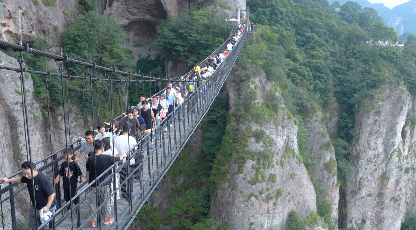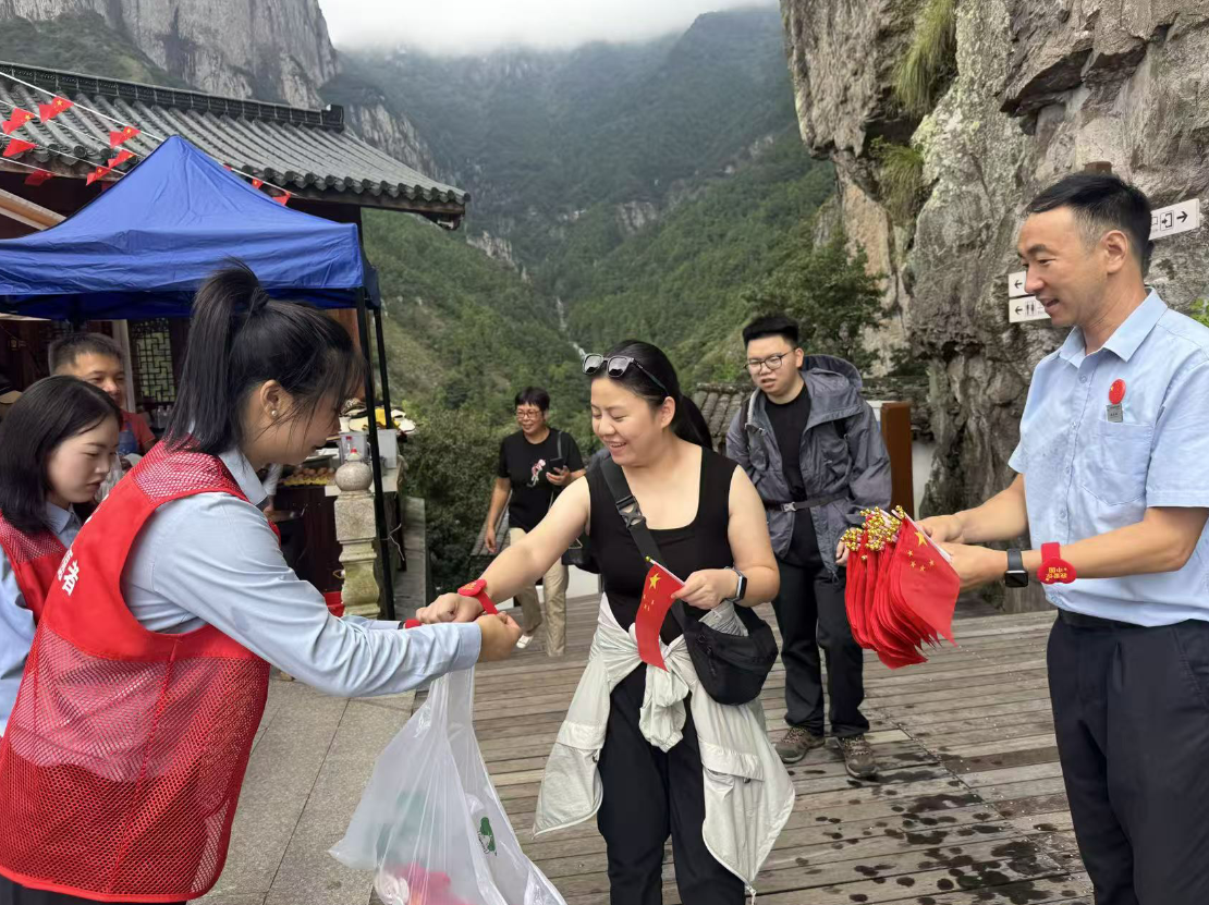 在方洞景区,游客们打卡“悬崖咖啡”,登临卧云栈道,景区工作人员为游客分发国旗,红色旗帜在半空中连成一片流动的“红海”。在灵峰景区,游客们或驻足观音峰下,欣赏越剧演员的水袖翻飞,或踏足真际寺,体验一段祈福之旅。