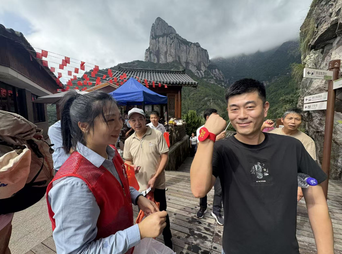 国庆假期,景区工作人员及志愿团队分布在游客集散候乘场所,提供打卡拍照、旅游咨询、路线指引、免费饮水、医疗救助等多样服务,为市民游客的雁荡山之旅增添了一份别样的温馨与欢乐。