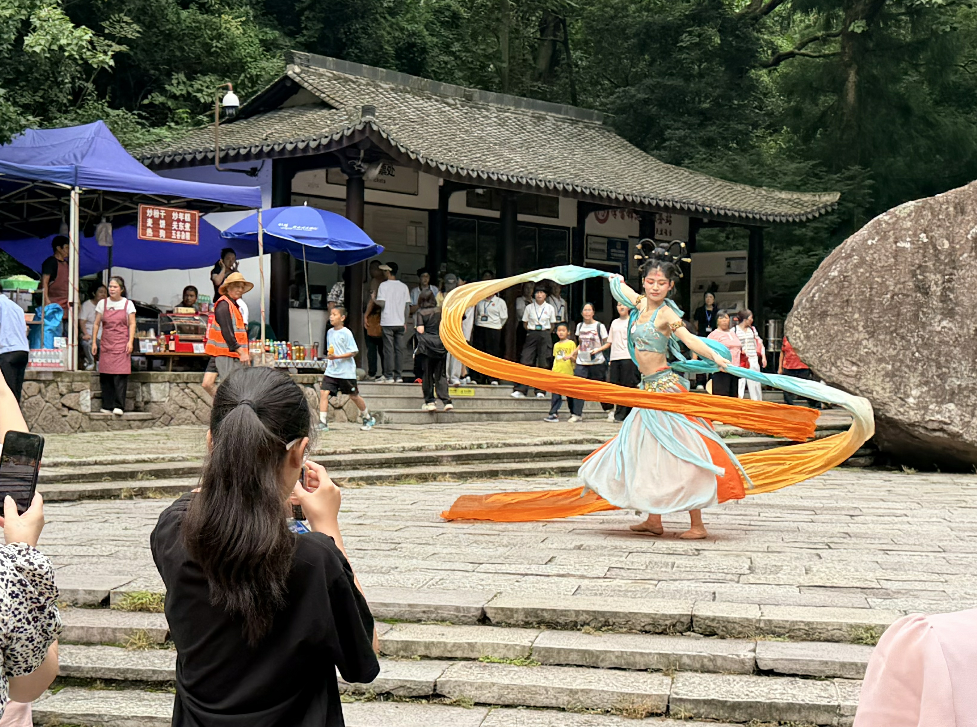在灵岩景区,上午九点半,国风真人秀刚开场就被游客围得水泄不通。“飞天”踏着敦煌乐音翩翩起舞,绸缎如流霞般划过天空;“徐霞客”与书生在山崖旁探讨山河奥秘;断肠崖下,“杨过”与“小龙女”的重逢剑舞赢得阵阵掌声。