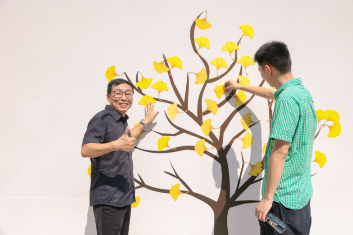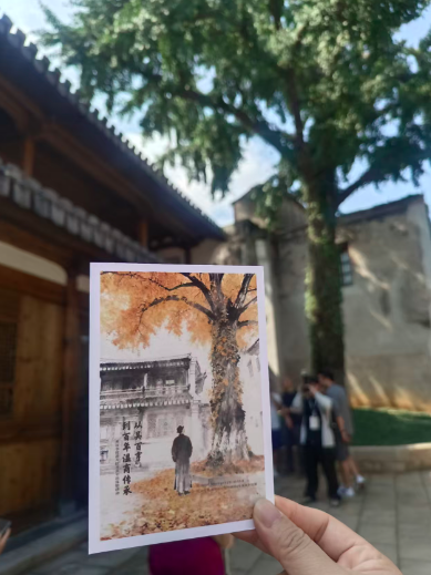 此外,故居内设置了两处特色打卡点,一处为穿过“紫气东来”大门,便可见到的“擒雕”品牌雕塑墙,另一处则为院内现存一棵编号为“1-51”的百年银杏树,这是鹿城区目前唯一登记在册的古银杏。虽然还未深秋,银杏树叶子还没有变黄,当天一早就已有不少市民在两处“趣拍点”拍照打卡。