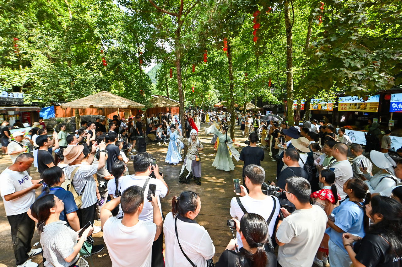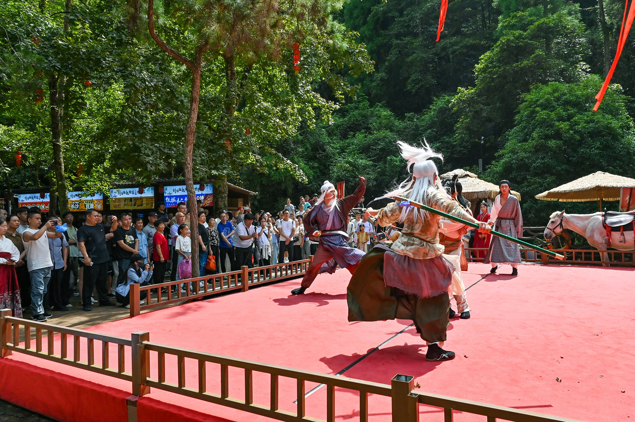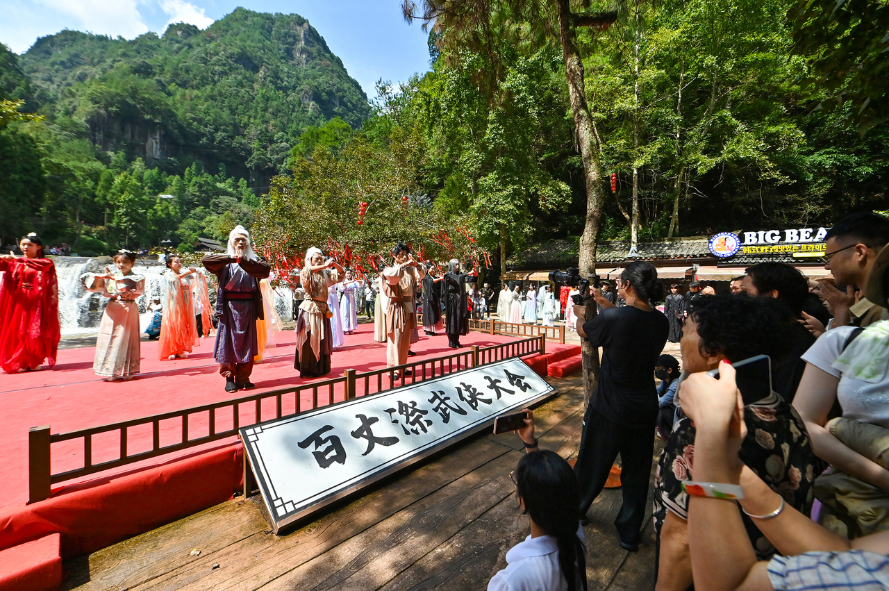 从NPC角色互动到高空威亚表演,从武侠主题纪念品发放到地方美食推荐,这场以“山水+武侠”为核心的文旅盛宴,让游客沉浸式感受了金庸武侠文化的魅力。