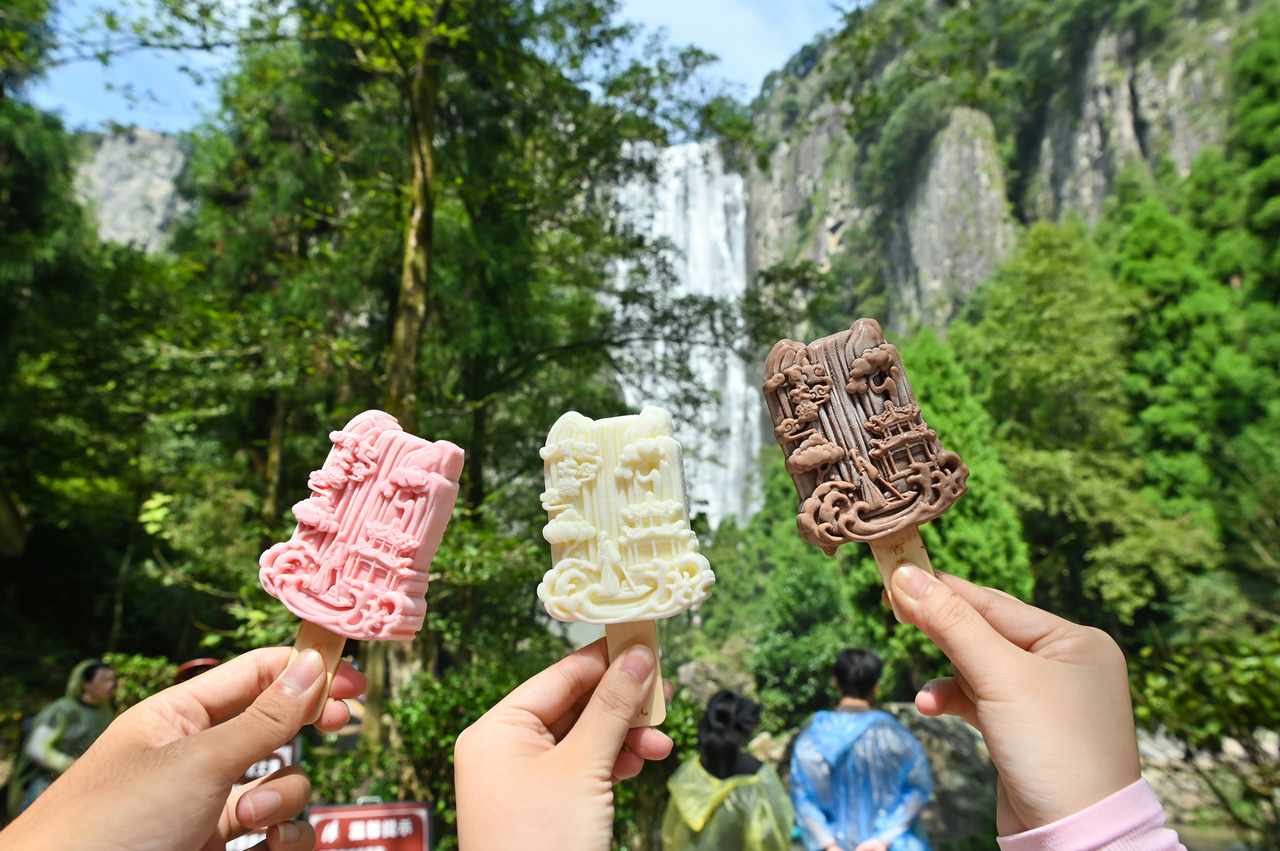 为了给每一位参与者带来视觉与娱乐的享受,景区还以金庸武侠文化为核心,通过经典人物在百丈漈的“偶遇”与“切磋”,打造沉浸式、互动性强的武侠情景短剧。来自湖南岳阳的游客刘女士和“洪七公”互动后获得了美食秘籍,根据卡片上面的推荐品尝了本次活动特别定制的文创雪糕。“从来没有参与过这样的互动活动,定制的雪糕也很特别,是百丈漈瀑布和金庸人物的造型,体验感非常好!”