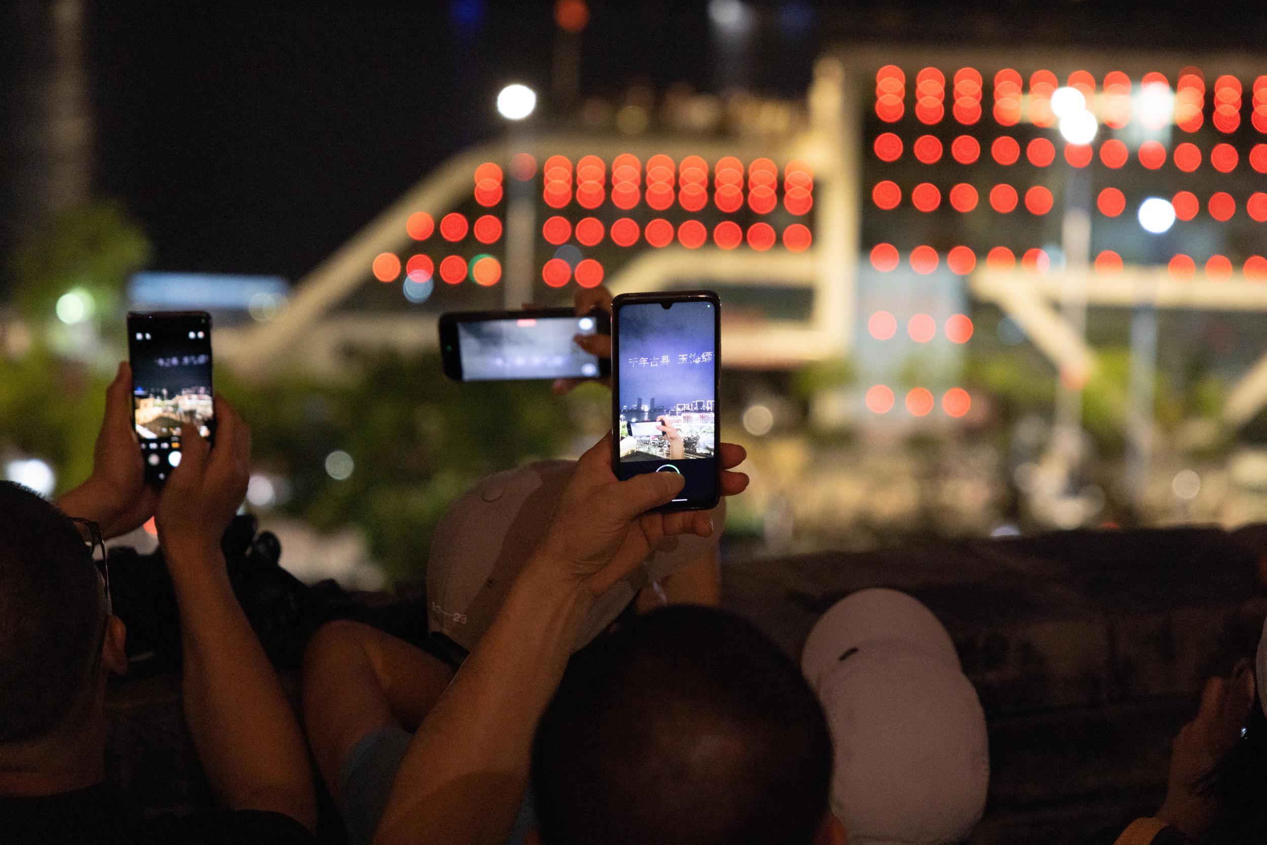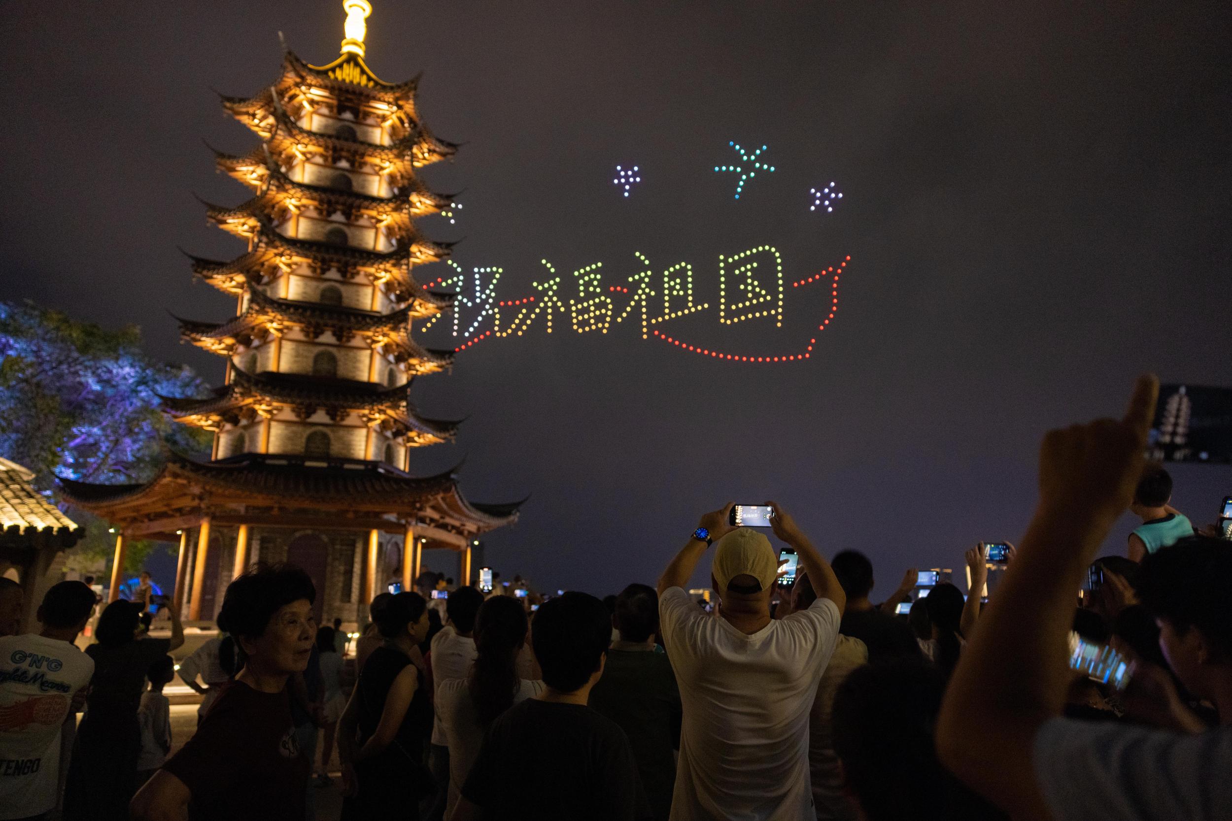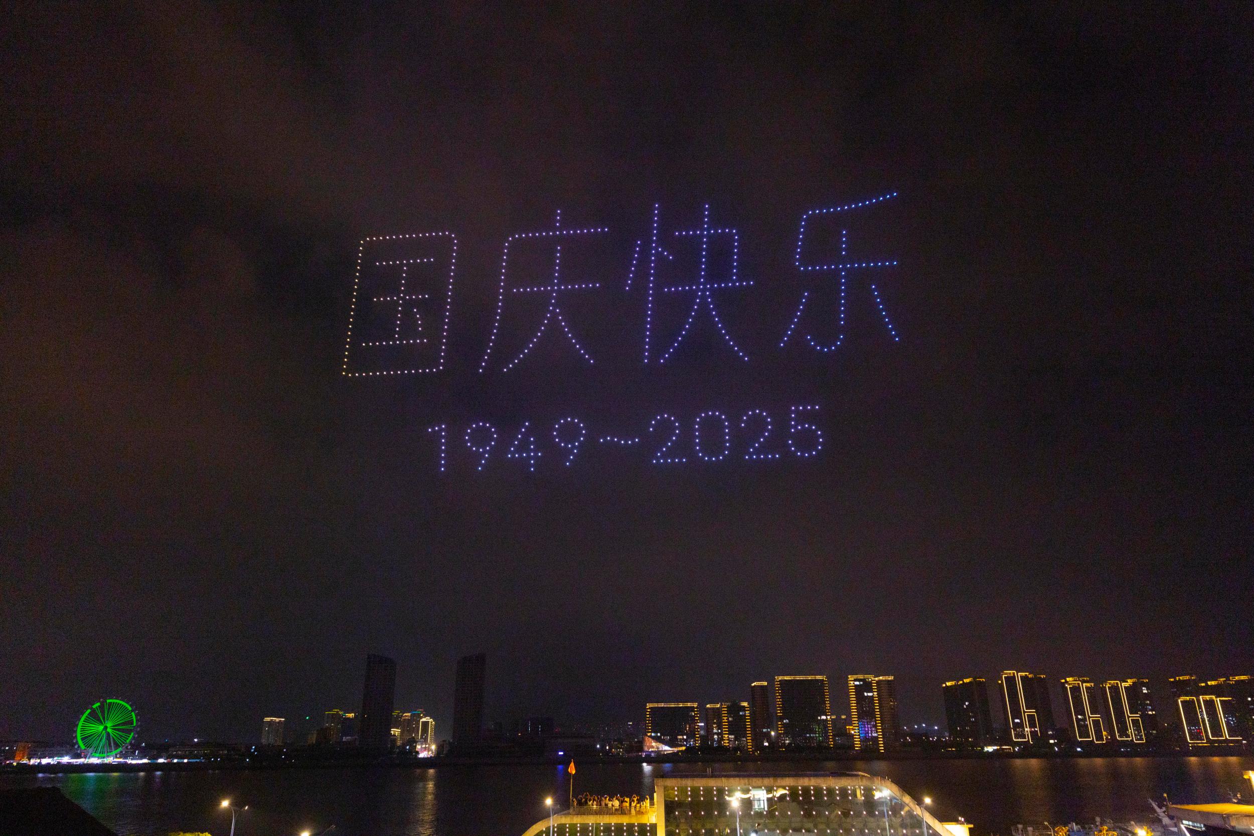 与此同时,不远处的西山历史文化街区上空,无人机编队以夜空为幕,变幻出庆国庆的绚丽图案,为节日夜晚增添了科技与艺术交融的魅力。