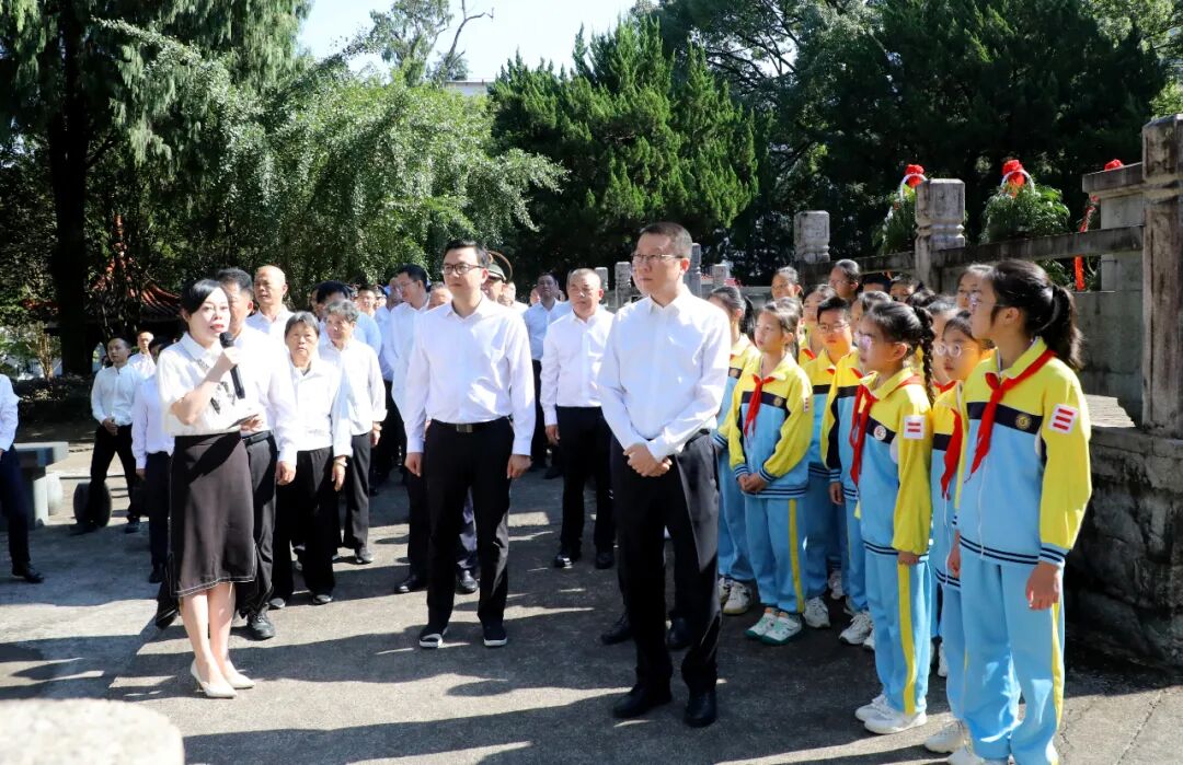 伴随着婉转低回的《献花曲》,12名礼兵稳稳抬起花篮,正步向前、拾级而上,将花篮在革命烈士纪念碑前整齐排开。丁熠锋、陈钷、雷全勉、赖立峰、吴中武、少先队代表等迈步向前,在花篮前驻足凝视,并仔细整理花篮上的红色缎带。随后,全体人员依次缓步绕行革命烈士纪念碑,向英雄烈士献上手中鲜花、表达最崇高的敬意。