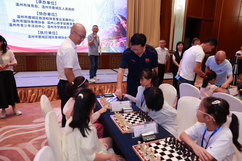 男子国际特级大师叶荣光、叶江川,以及温籍“世界棋王”丁立人来到现场,为小棋手们开启战局。值得一提的是,丁立人此次是趁国庆中秋双节回乡休整,得知赛事举办便欣然应邀。当这位世界棋王随机走到一盘棋前,准备为对弈双方开棋时,原本端坐的小棋手一时间愣住了,甚至忘记了与偶像握手——这意外又真实的反应,引得周围一阵善意的轻笑。