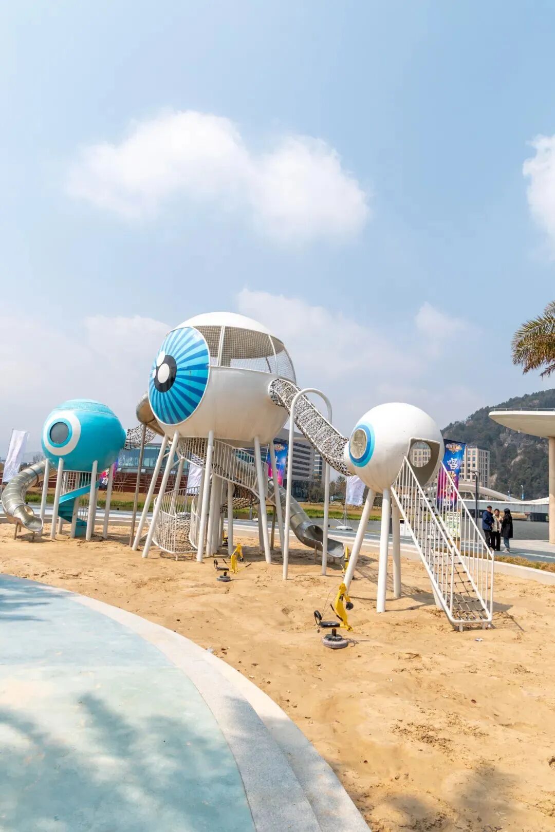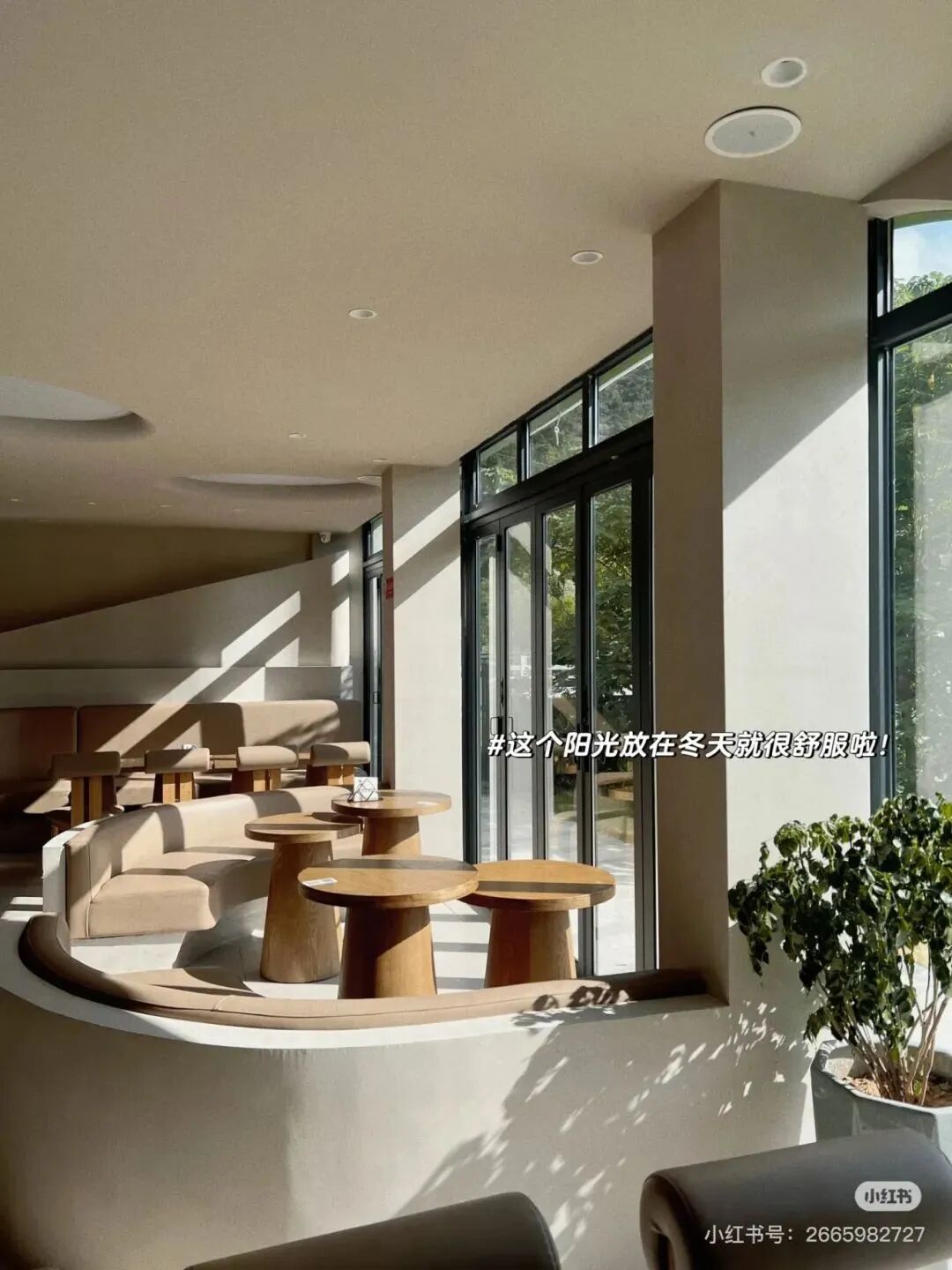 山下的二楼还有一整面的观景窗,右手边是绿意盎然的自然风光,左手边则是童趣满满的游乐园,生机与活力,静谧与享受于此完美融合。