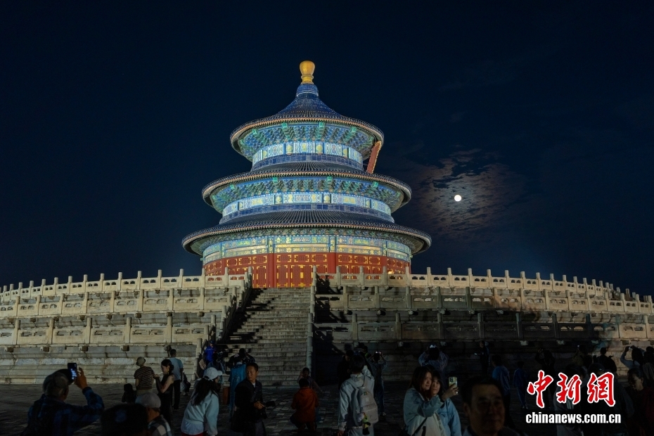 10月6日是中秋佳节,北京天坛公园祈年殿亮灯,一轮圆月从东方升起,与祈年殿交相辉映。中新社记者 张炜 摄