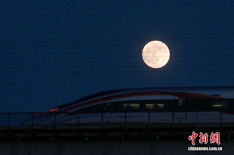 10月6日中秋节,福建福州,一列“复兴号”动车组列车与圆月同框。中新社记者 吕明 摄