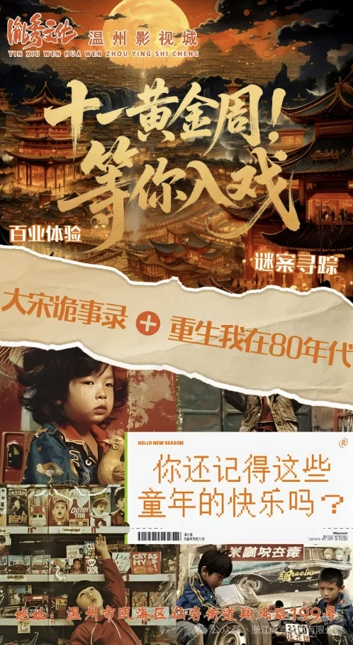 今年“十一”期间,国庆、中秋双节同庆。胤秀文化(温州)影视城也推出“双城联动”玩法,带来双重时空的精彩碰撞。民国风情街区展露复古情怀:火车站前的钟楼、星光大戏院、万丰银行……每一处建筑都仿佛凝固了旧日时光。霓虹闪烁的百乐门前,与穿着喇叭裤、波点裙的劲舞团共跳恰恰舞,乘上黄包车穿行街巷。《重生我在80年代》的主题唤醒一代人的童年记忆,也让人在烟火气中感受国泰民安的盛世温情。