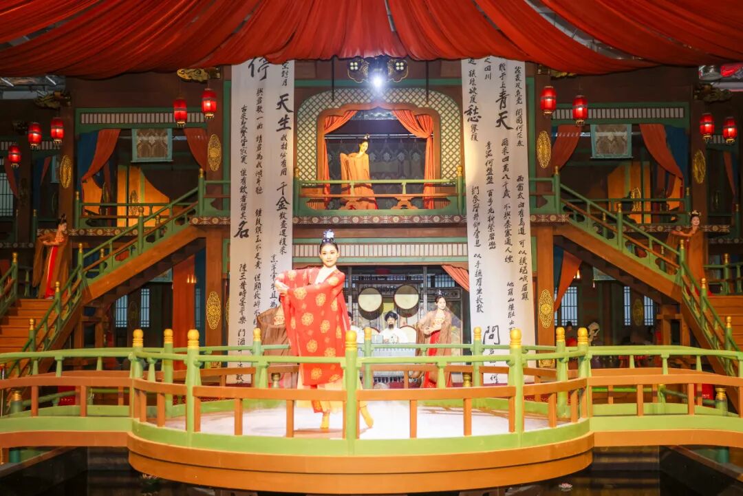 在唐宋古风街区,大型实景互动剧本游《大宋诡事录》正在上演。游客领取专属角色卡后,即可化身宋朝百姓,体验镖师、卖货郎、打更人等百业人生。街区汇聚20余个古风集市,不仅设有传统小吃,还容纳了对弈、义诊、投壶、点茶、博戏等多项古代民间活动,还原市井风情。实景剧本每小时更新,30多场精彩表演轮番登场——酒馆前侠客激斗正酣,酒楼中花魁竞艳夺目。游客在游玩中搜集线索,不知不觉间已如明察秋毫的大宋提刑官一般,抽丝剥茧,逐步揭开谜题真相。当暮色渐沉,千万花灯次第亮起,与亲朋挚友一起吃着月饼共度团圆夜的同时,让繁华灯火洗去一身的疲惫。从早上9点到晚上21点,12个小时的光景里,50多位演职人员都是你自有剧本中的鲜活角色,和你一起入戏人生。