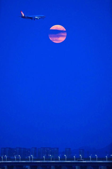 “超级月亮” 遇上归航飞机,温州夜空现绝美同框