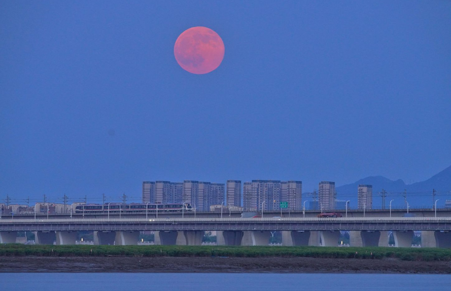 在温州市龙湾区瓯江之上,一列车驶过江面时,与天宇“超级月亮”精准同框。