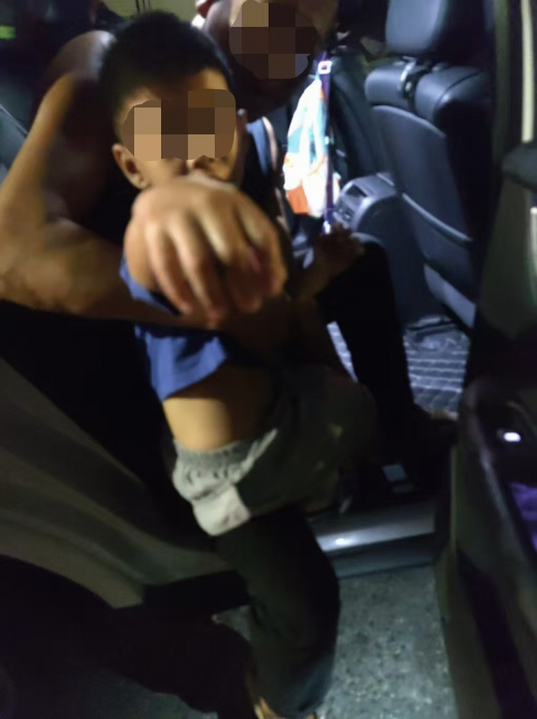 消防救援人员于到场后发现,小孩手臂被卡位置为轿车门把手缝里无法动弹,由于小孩手臂因长时间受挤压,已出现轻微肿胀,皮肤发紫,情绪较为紧张。