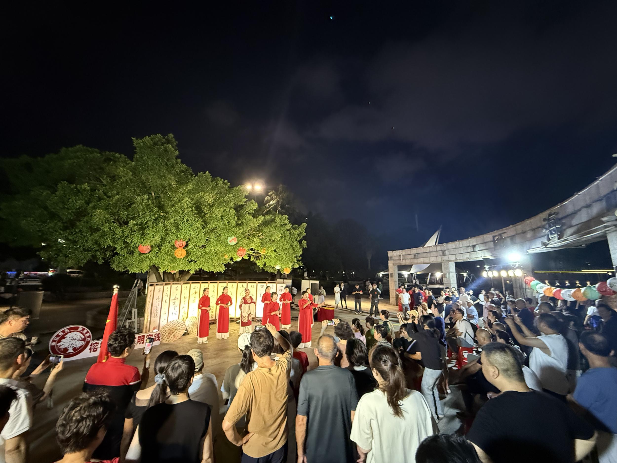 当晚的活动在《祝福祖国》的歌声中落下帷幕,全场在挥动的国旗中,大家齐声用真挚的歌声表达对祖国的深情祝福。月光、榕影、笑语、歌声,交织成家国同庆的温暖画面。