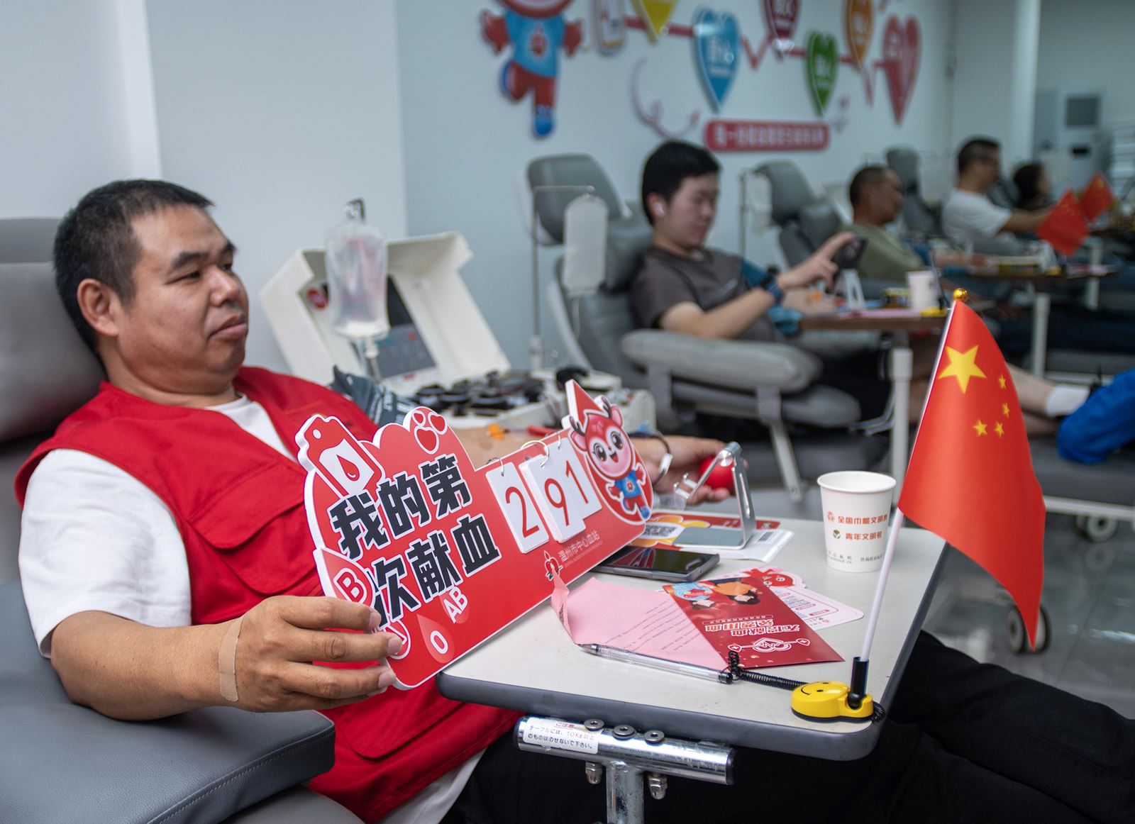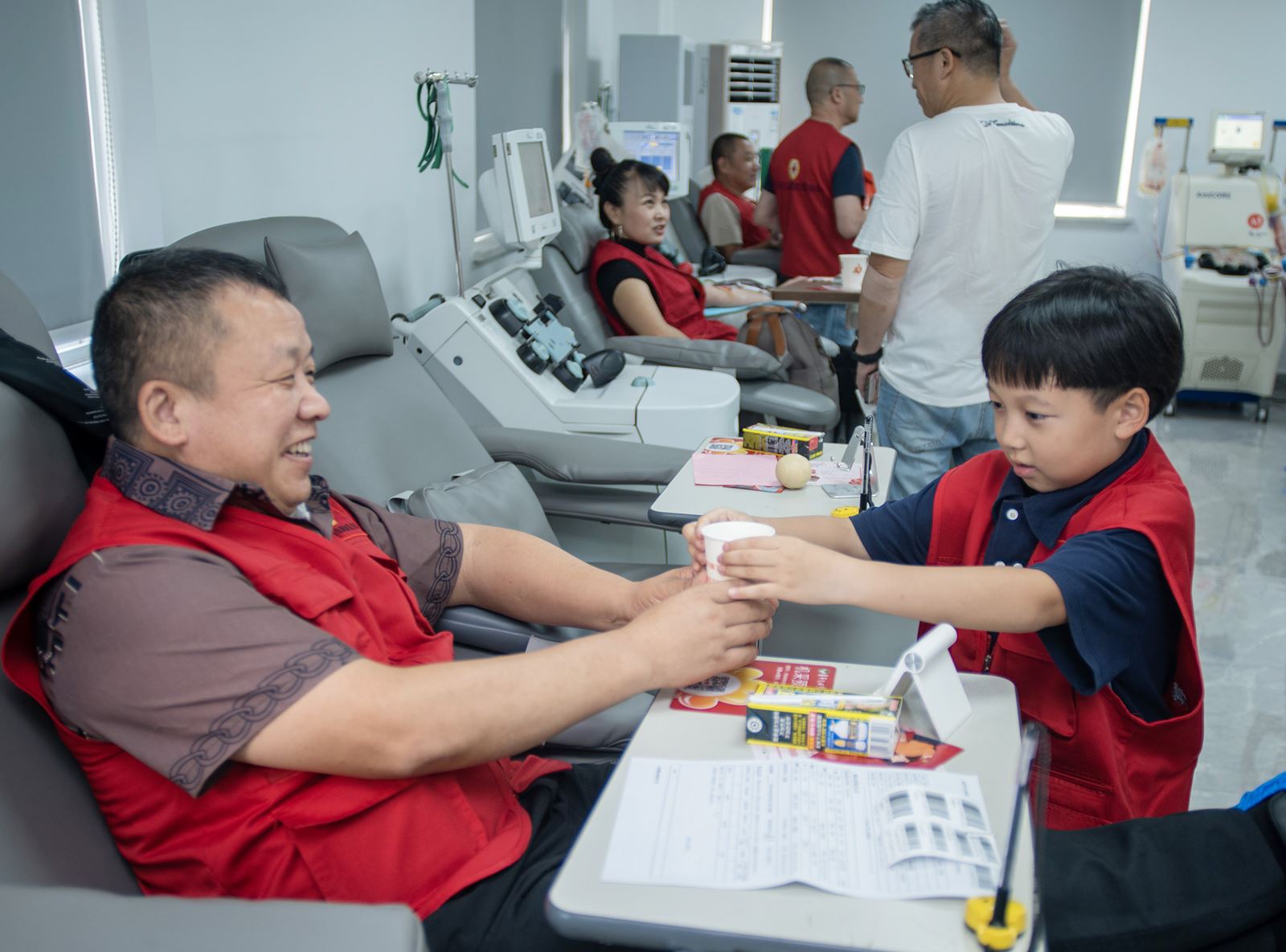 一些志愿者带着家里的小孩子来采血大厅做志愿服务,从小培养孩子的公益意识。余日迁 摄影报道