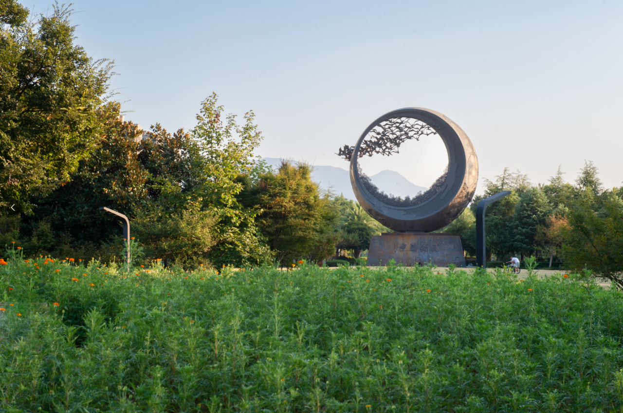 行至光影草原南侧,公园的主雕塑“瓯居海中”巍然矗立。这座重约18吨、近六层楼高的艺术品,以圆月为形,与周边疏林草地的环境和谐相融。雕塑上方,成群海鸥呈现振翅高飞之姿,在蓝天绿草的映衬下,更显灵动与力量,艺术化地诠释了温商团结协作、开拓进取的精神,成为温州世纪公园画龙点睛的景观。与之相呼应的“百丈花海”与2000多平方米的“光影草原”,通过精心的植物搭配,创造出四季皆景的观赏效果,成为中轴线上又一打卡点。