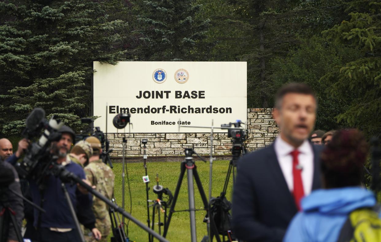 8月14日,媒体记者在美国阿拉斯加州安克雷奇的埃尔门多夫-理查森联合军事基地外报道。新华社记者吴晓凌摄