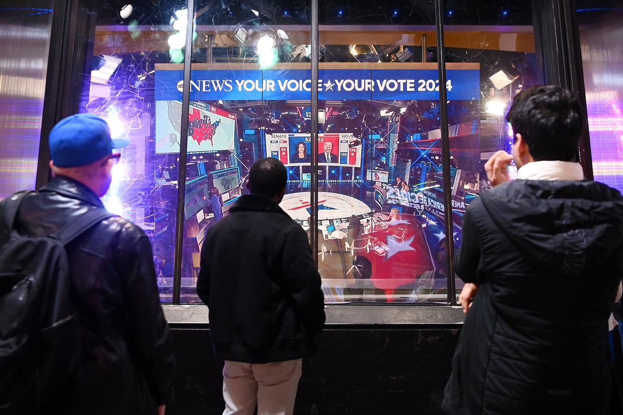 2024年11月5日,人们在美国纽约时报广场观看实时出口民调。新华社记者李睿摄