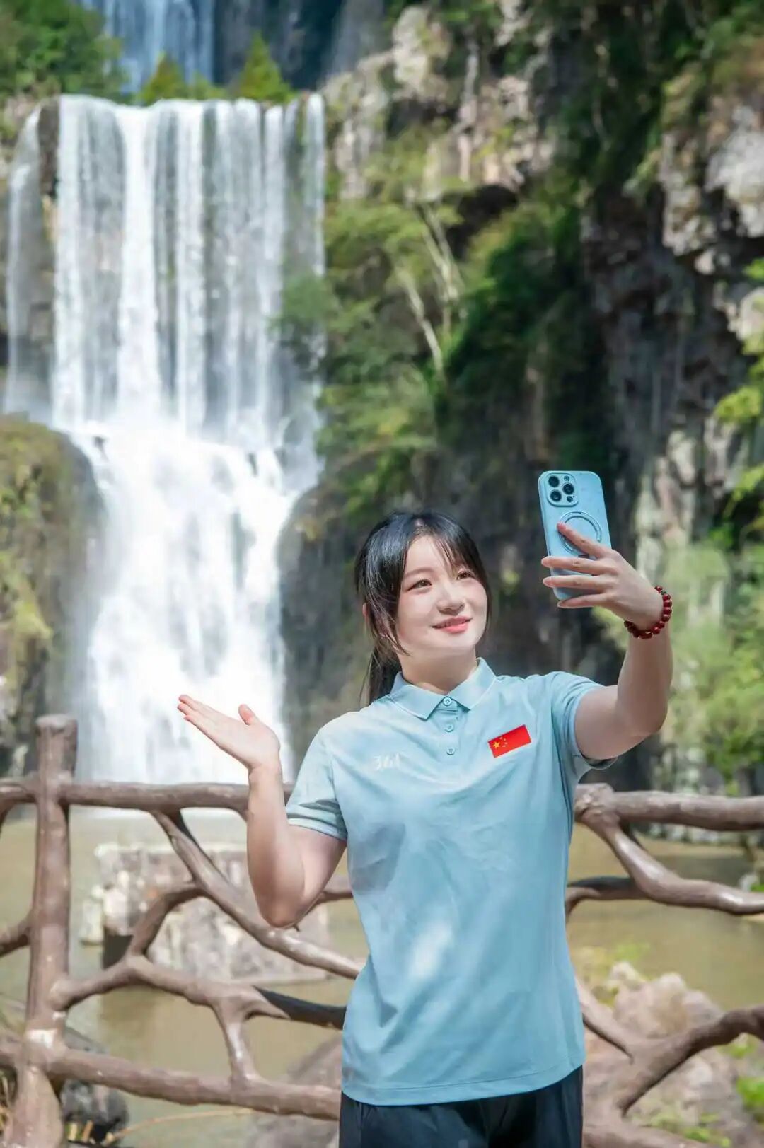 此次载誉归乡,廖依琳特意带着家人重游刘伯温故里百丈漈。站在二漈观景平台,看着飞流直下的瀑布,她忍不住拿起手机记录。