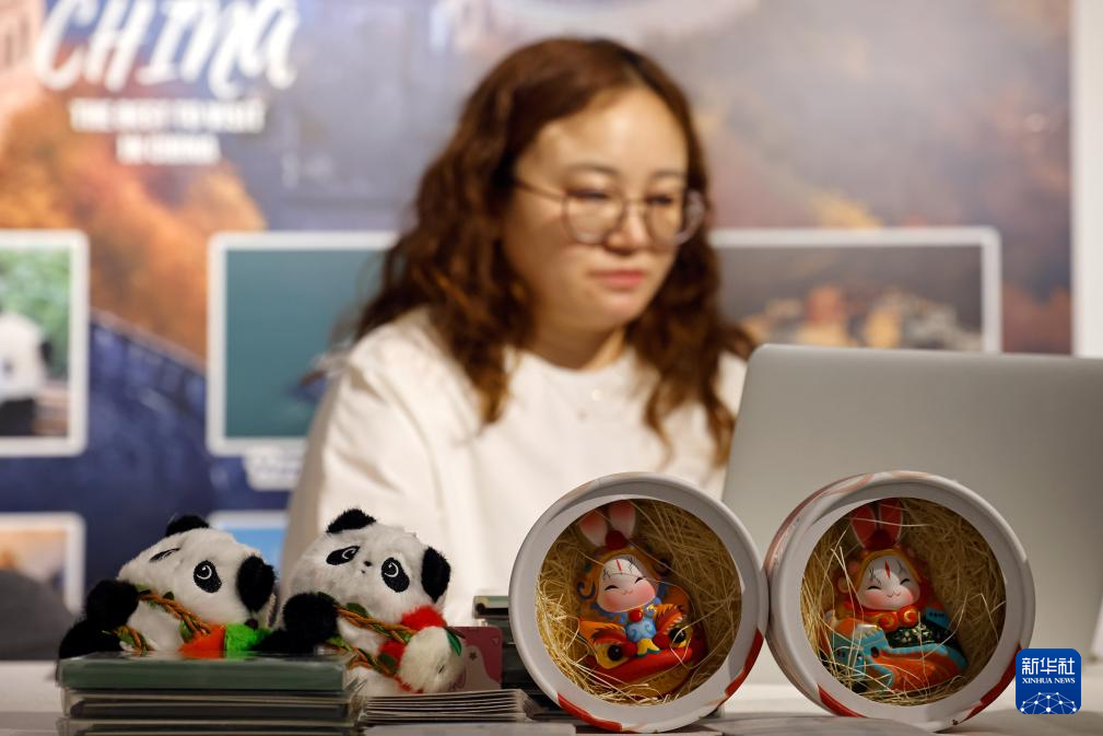 这是10月10日在罗马尼亚首都布加勒斯特拍摄的2025中国旅游展上的吉祥物。