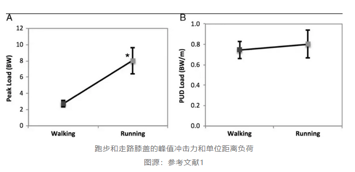 所以如果考虑整个运动过程,在单位距离上,跑步时候膝盖承受的冲击并没有比走路大出多少(下图右侧所示)。