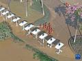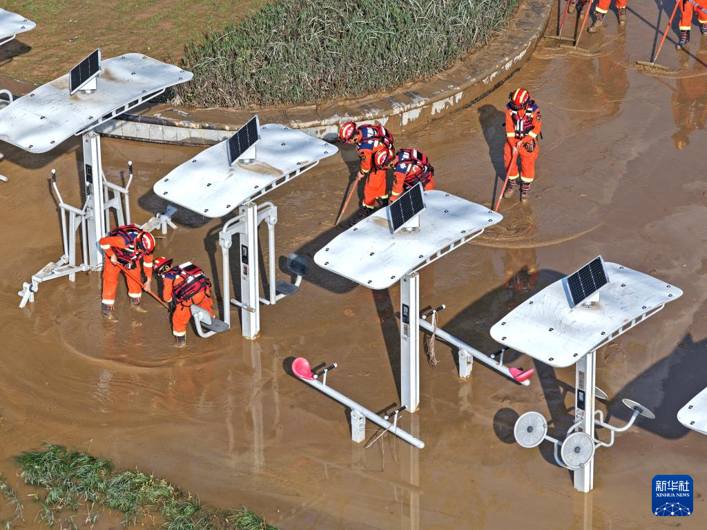 10月12日,消防救援人员在郁江广西南宁城区河段岸边清淤(无人机照片)。随着郁江水位稳步回落,郁江广西南宁城区河段清淤工作全面展开。新华社记者 周华 摄