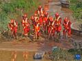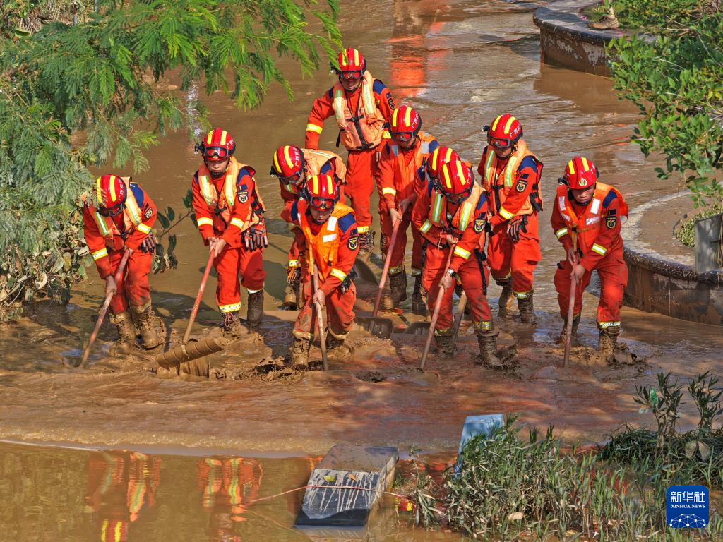 10月12日,消防救援人员在郁江广西南宁城区河段岸边清淤。随着郁江水位稳步回落,郁江广西南宁城区河段清淤工作全面展开。新华社记者 周华 摄