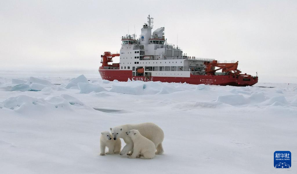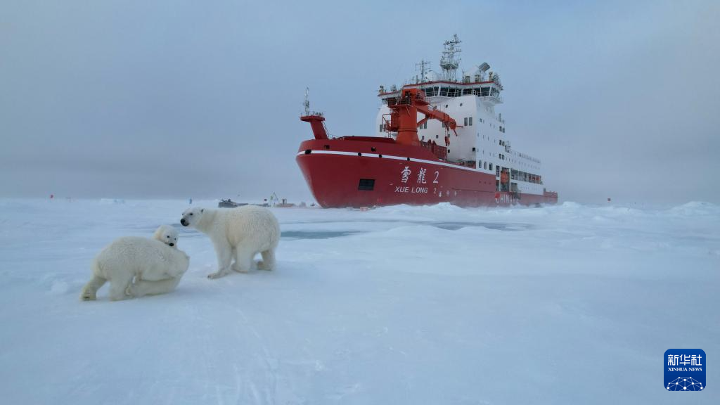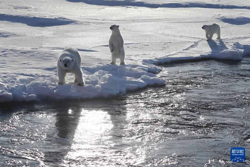 8月31日,北极熊妈妈带着两只熊宝宝向“雪龙2”号船张望。