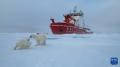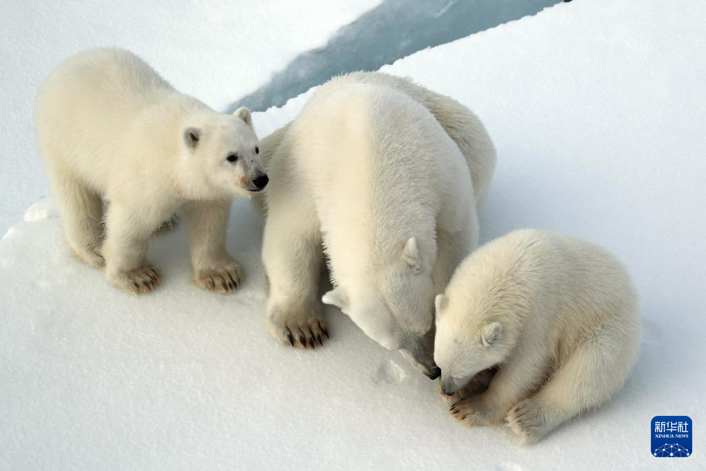 8月31日,北极熊妈妈和两只熊宝宝在“雪龙2”号船边休息玩耍。