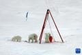 ?8月30日,北极熊妈妈和两只熊宝宝在防熊苹果屋前活动。