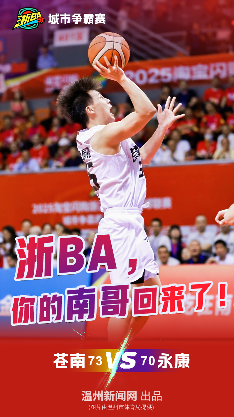温州网讯(记者 温婉)10月16日晚,浙BA城市争霸赛在苍南体育中心体育馆举行。苍南队坐镇主场,迎战劲旅永康队。最终经过激烈厮杀,苍南队以73:70的比分,战胜了永康队。
