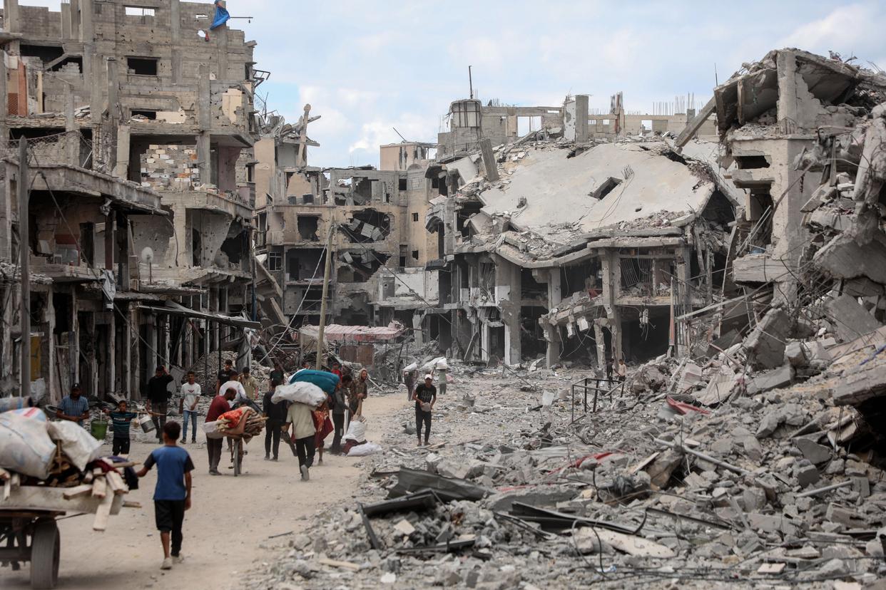 10月12日,在加沙地带南部汗尤尼斯,重返家园的巴勒斯坦人走过严重受损的建筑。新华社发(里泽克·阿卜杜勒贾瓦德摄)