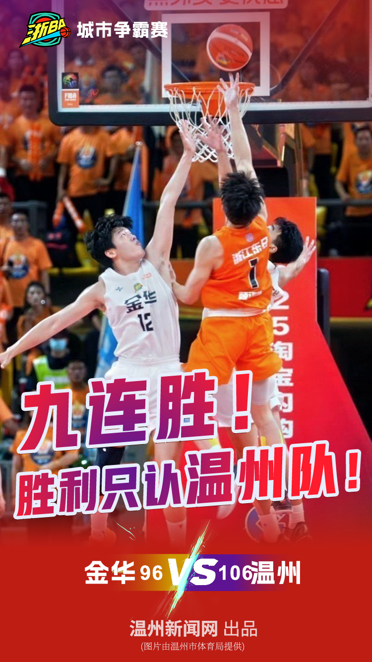 温州网讯(记者 温婉)10月18日晚,浙BA城市争霸赛在金华市体育中心体育馆进行。温州队客场挑战金华队,双方经过四节激烈对抗,最终温州队以106:96战胜对手,豪取九连胜。