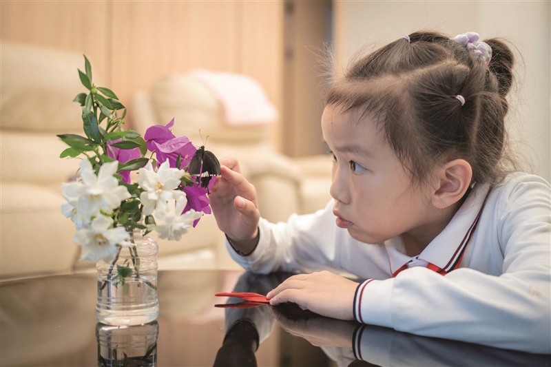 一瓶清水中,插入几枝嫩叶、几朵鲜花,再用一个薄纱笼罩,这就是孩子们突发奇想为蝴蝶搭建的孵化园。他们请不同种类的蝴蝶“入住”不同的“房间”,插入清水的鲜花,则是孩子们为蝴蝶准备的食物。