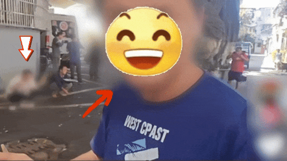视频开头,却有两名男子格外显眼:他们一个站着一个蹲着,大口吃着爱心饭菜,面对志愿者工的问候还连连称赞和点头,不忘咧嘴笑着回应。