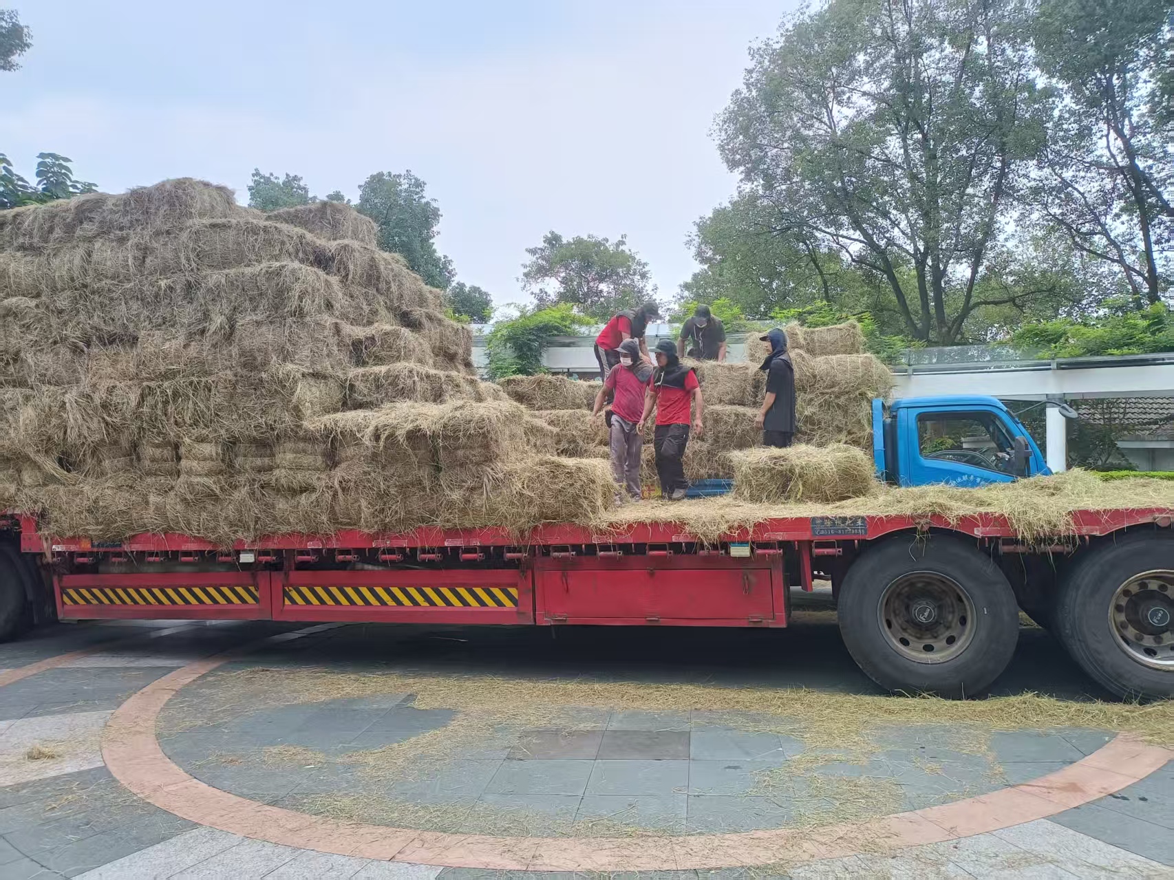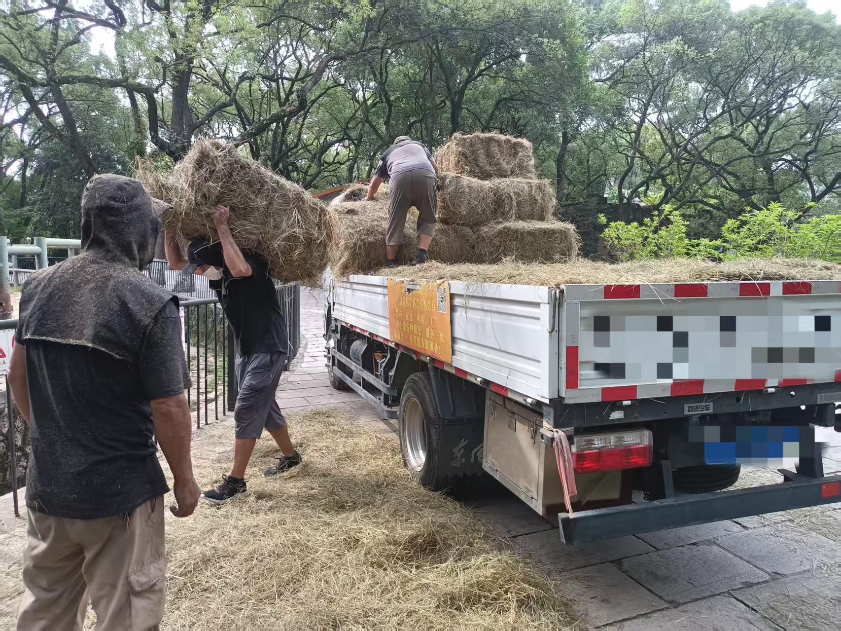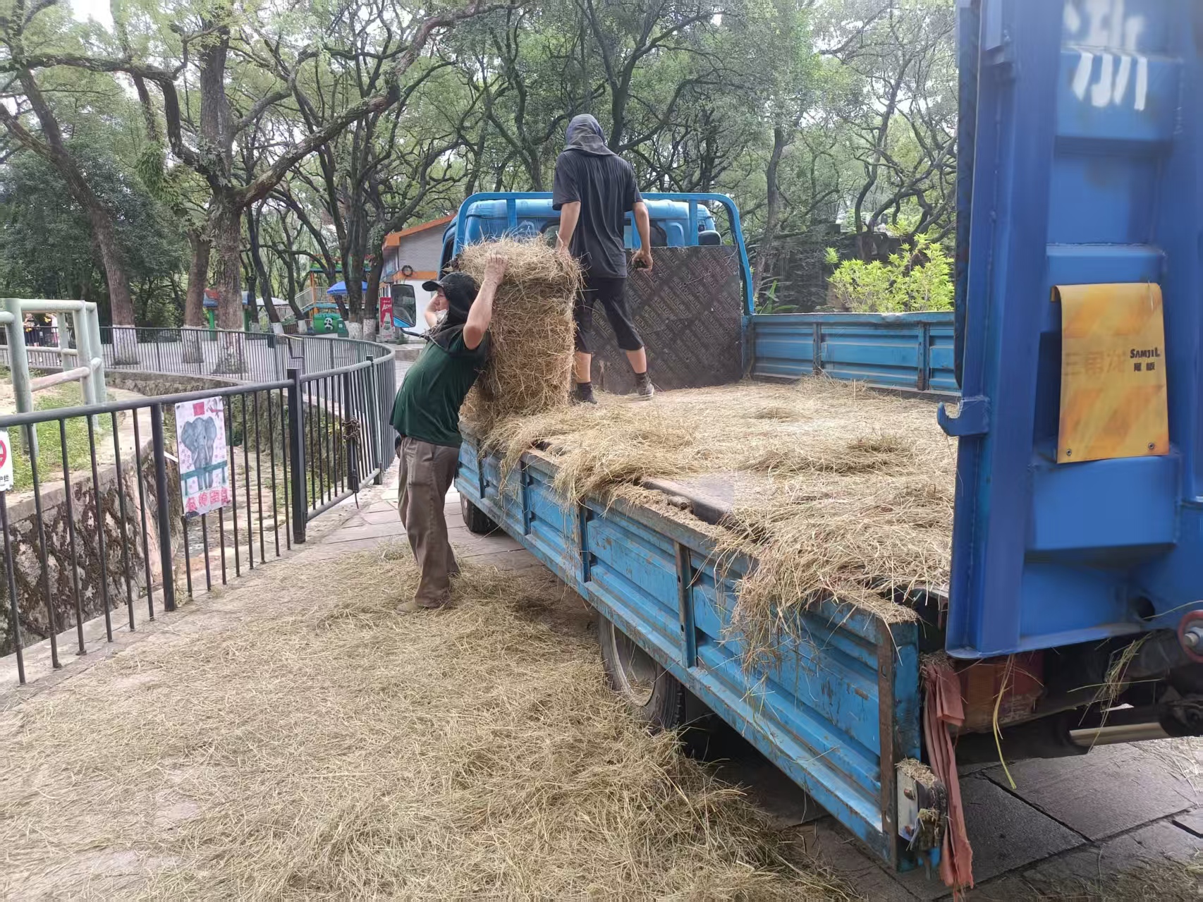 清晨六点,一辆满载东北羊草的大型货车缓缓驶入动物园。12名搬运师傅早已准备就绪,开始了与时间的赛跑。“天气预报说午后有雨,大家抓紧时间!”工人们立即两两一组行动起来。