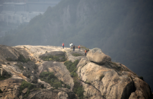 中午时分,哨子墩的“天罗奇秀”观景台同样挤满了人。围绕着观景台,烧烤摊、露天咖啡、冷饮摊,摆了一路。而在近处的几处奇岩巨石高峰上,一些攀岩登顶的人,正在拿出手机和相机随手拍摄,都市中的高楼大厦,便在山脚平地之上。此时,天空突然飘来一阵疾风骤雨,四周充满了久违的凉意。不一会儿,阳光突破云层照射到哨子墩一带,一道弯弯的彩虹低挂于山峰之上,渐趋明显,如给群峰着了一堆好看的色彩。这大约就是当天登顶大罗山的人最有眼福的一刻。