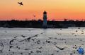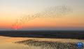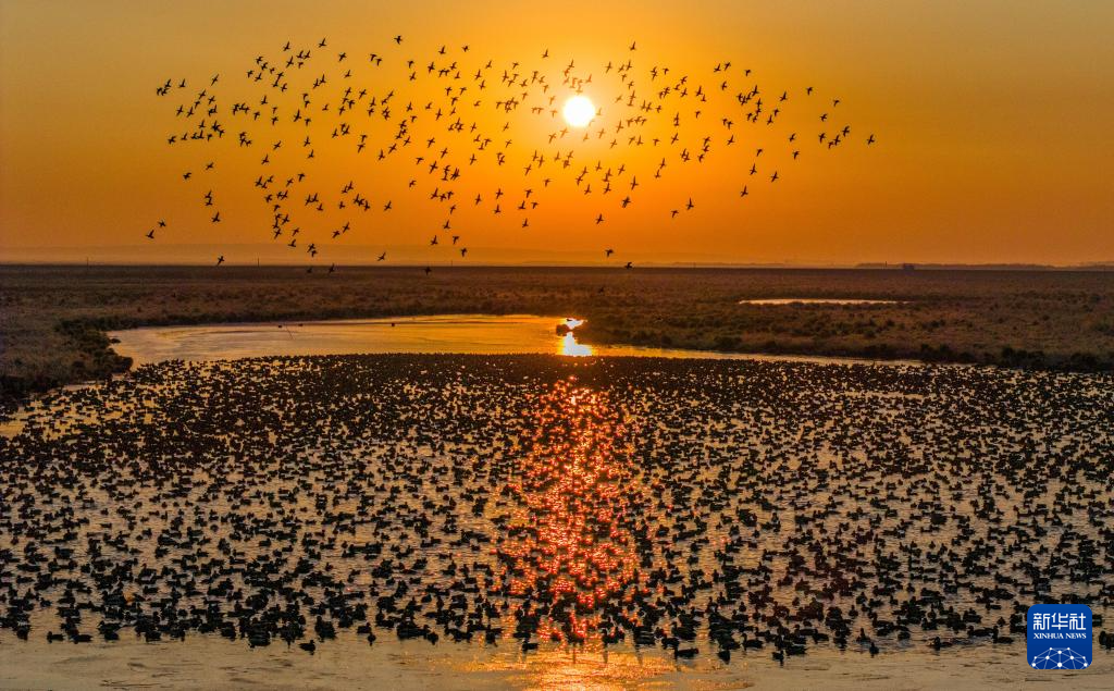 10月22日,在黑龙江挠力河国家级自然保护区,候鸟在晨光中翔集(无人机照片)。