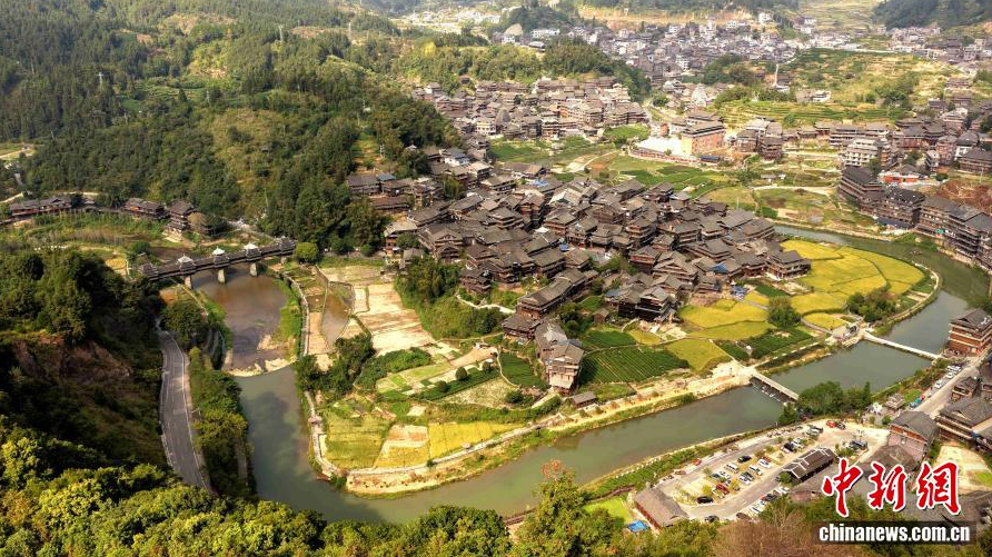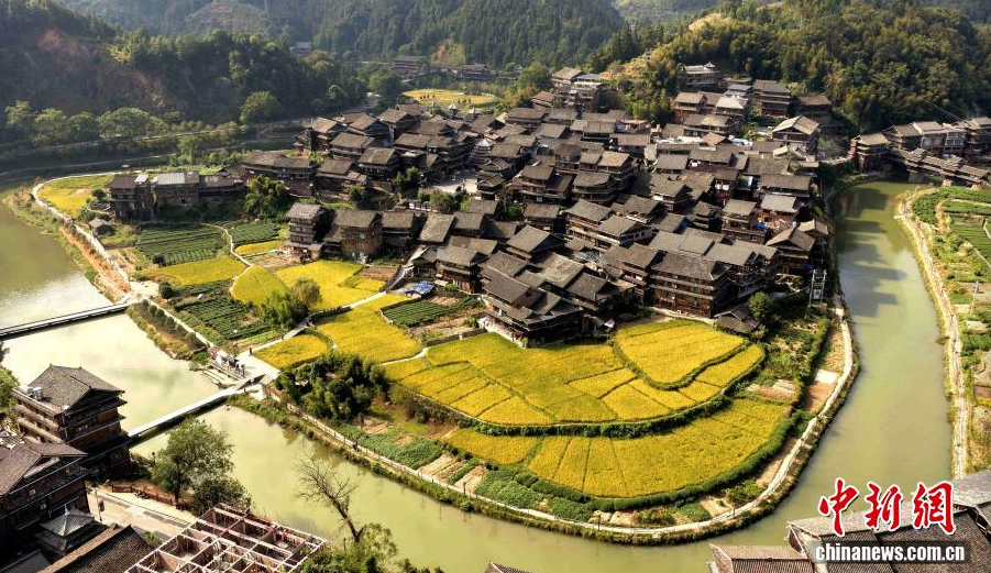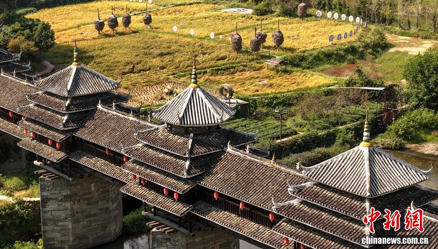 10月24日,在广西三江侗族自治县林溪镇程阳八寨景区,金黄稻田、古朴侗寨、蜿蜒河水与村民田间劳作的忙碌身影相映成趣,绘就一幅诗意盎然的金秋画卷。图为程阳八寨秋景。龚普康 摄