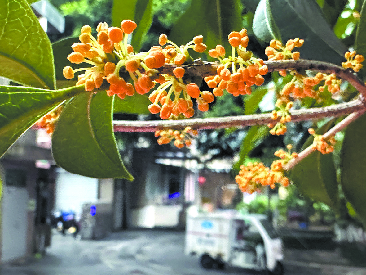 时下,我市进入“黄金季”,金黄的银杏叶、桂花瓣随风飘落,铺就出浪漫的“金色道路”,为城市增添了浓郁的秋日氛围,也让市民近距离感受季节之美。图为市区南汇锦园内绽放的桂花。 蒋文广 摄