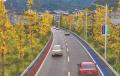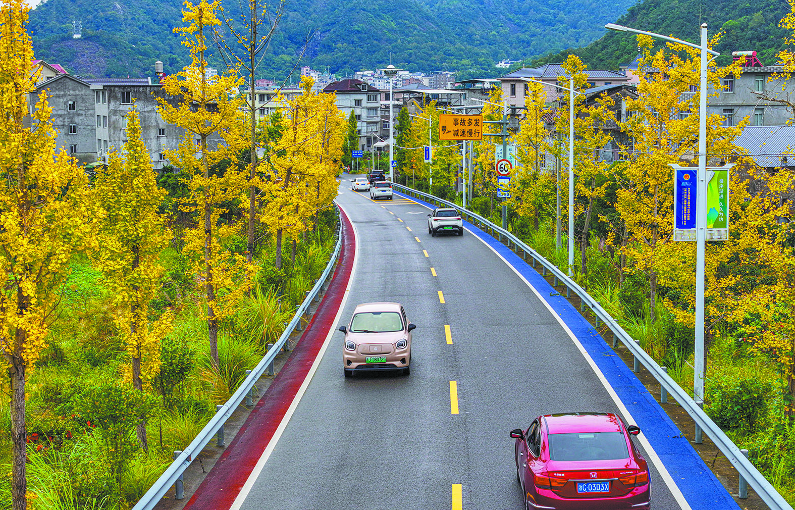 昨天,在乐清市大荆镇中庄村,染金的银杏树沿公路铺开,来往车辆穿行于金叶之下。 苏巧将 摄