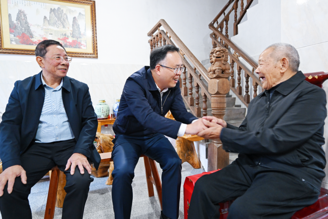 乐清市委书记戴旭强一行先后来到雁荡镇站前社区、石帆街道霞雪村和竹屿村,看望慰问百岁老人阮炳于、彭银安和王凤兰,为他们送去节日的诚挚问候与美好祝愿。“阿公阿婆,重阳节快乐!祝您身体健康、生活幸福。”每到一处,戴旭强都与老人及家属亲切交谈,悉心询问老人的生活起居、身体状况和家庭情况,并送上寓意吉祥的“福寿康宁”牌匾,祝愿老人身体康健、福寿绵长。看到老人们精神矍铄、家庭和睦,现场气氛温馨融洽,戴旭强对家属们践行孝道的行为表示赞许。他指出,百岁老人是时代发展的见证者,他们的健康长寿,既是家庭的福气,也是社会的宝贵财富。希望老人家属继续秉持爱心、耐心与细心,悉心照料好老人的日常生活,让尊老敬老的良好家风代代相传,为社会树立孝亲敬老的典范。