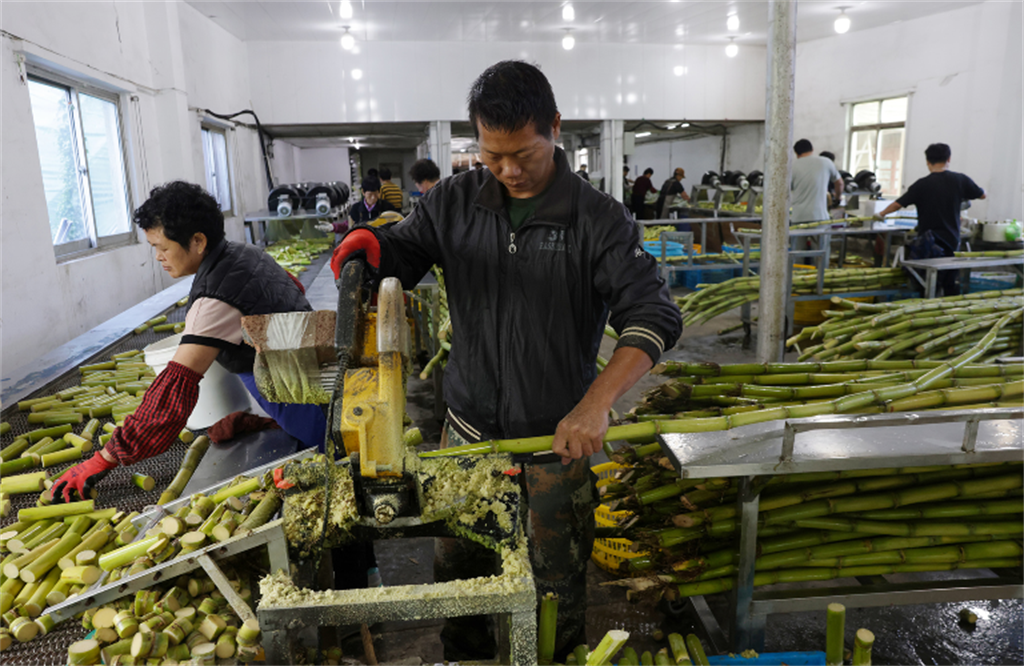 新鲜收割的甘蔗被直接运往附近的瑞安市前途果蔬专业合作社。摄影: 郑鹏