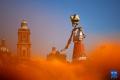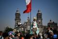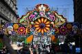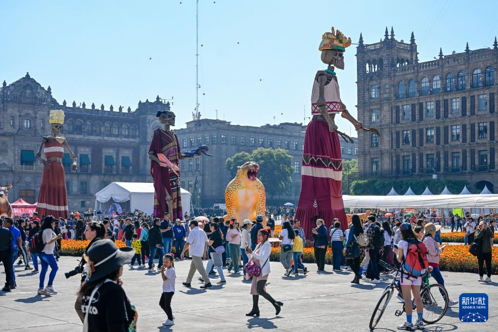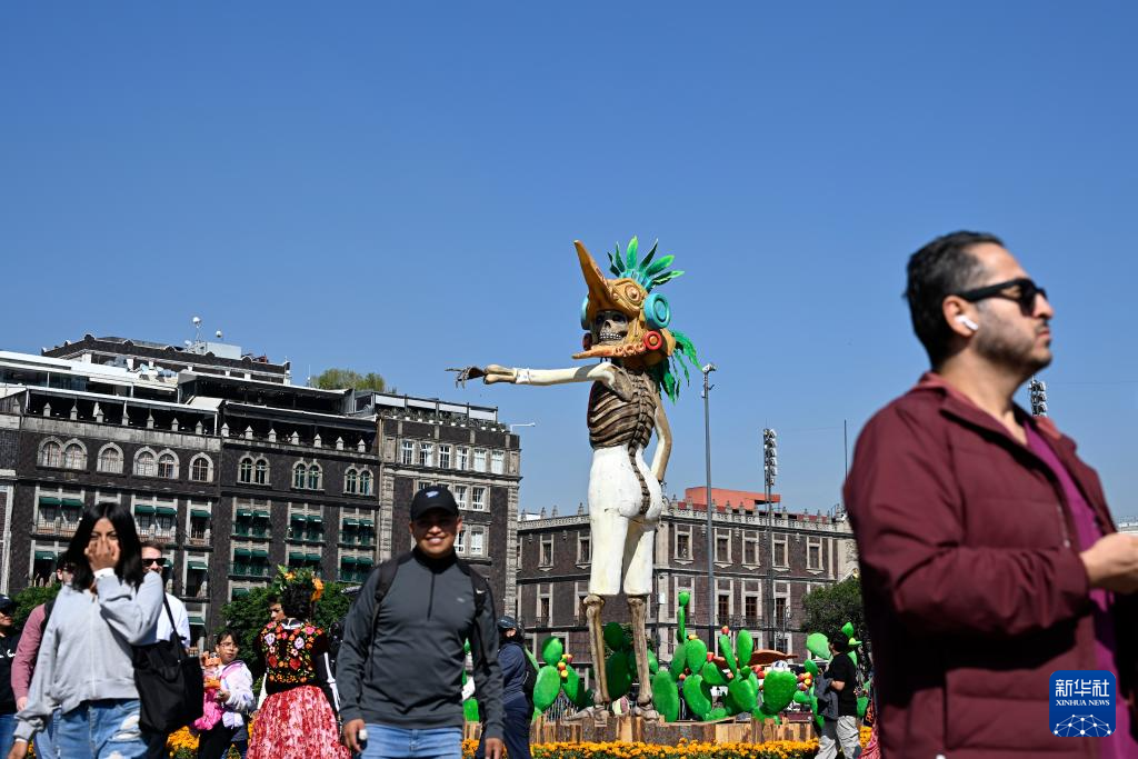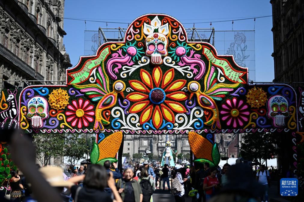 10月31日,民众在墨西哥首都墨西哥城的宪法广场观看亡灵节祭坛,今年宪法广场亡灵节祭坛的主题为纪念特诺奇蒂特兰建城700周年。