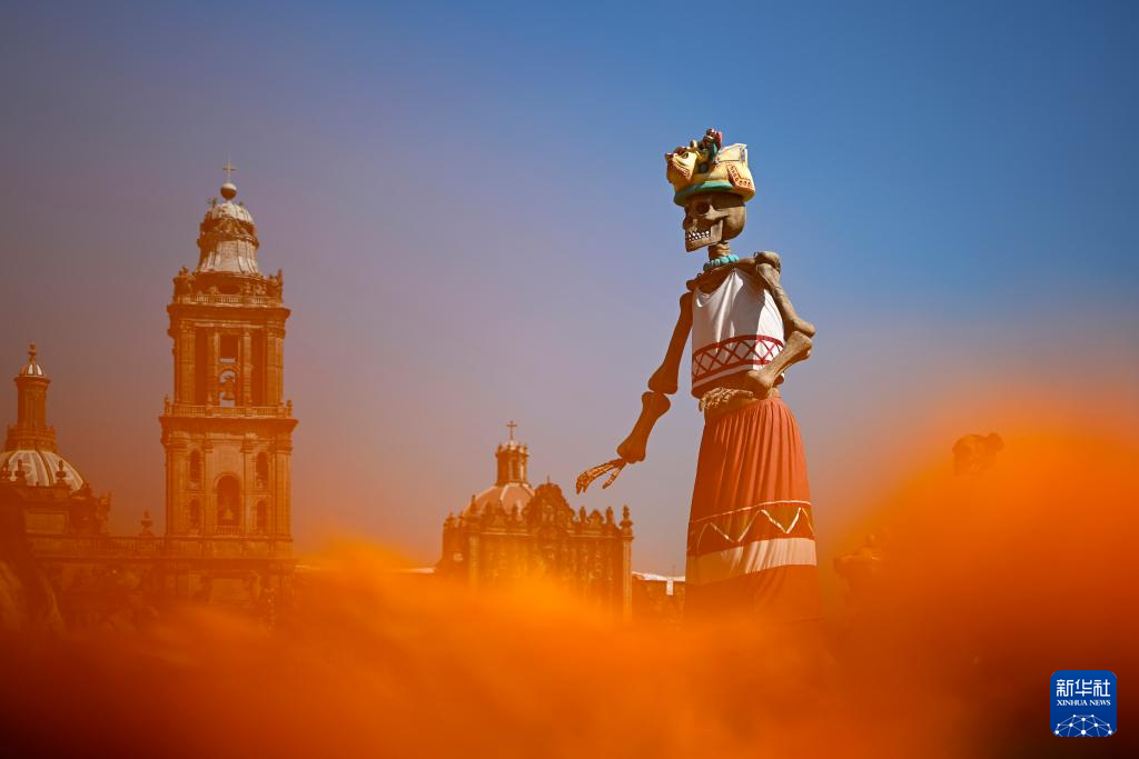 这是10月31日在墨西哥首都墨西哥城的宪法广场拍摄的亡灵节祭坛装饰物。