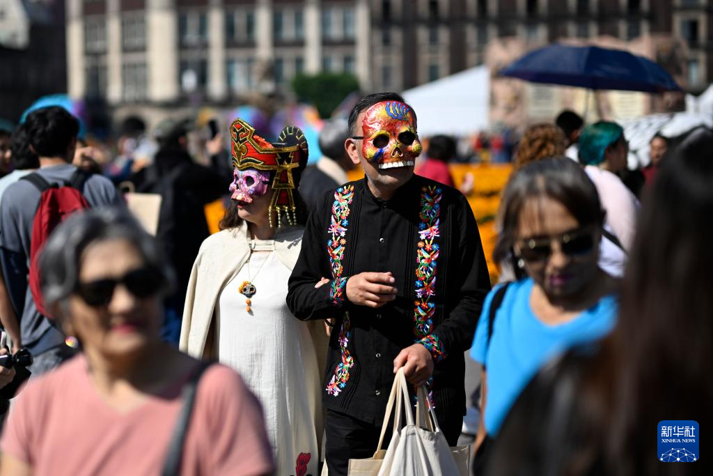 10月31日,民众头戴面具在墨西哥首都墨西哥城的宪法广场观看亡灵节祭坛。